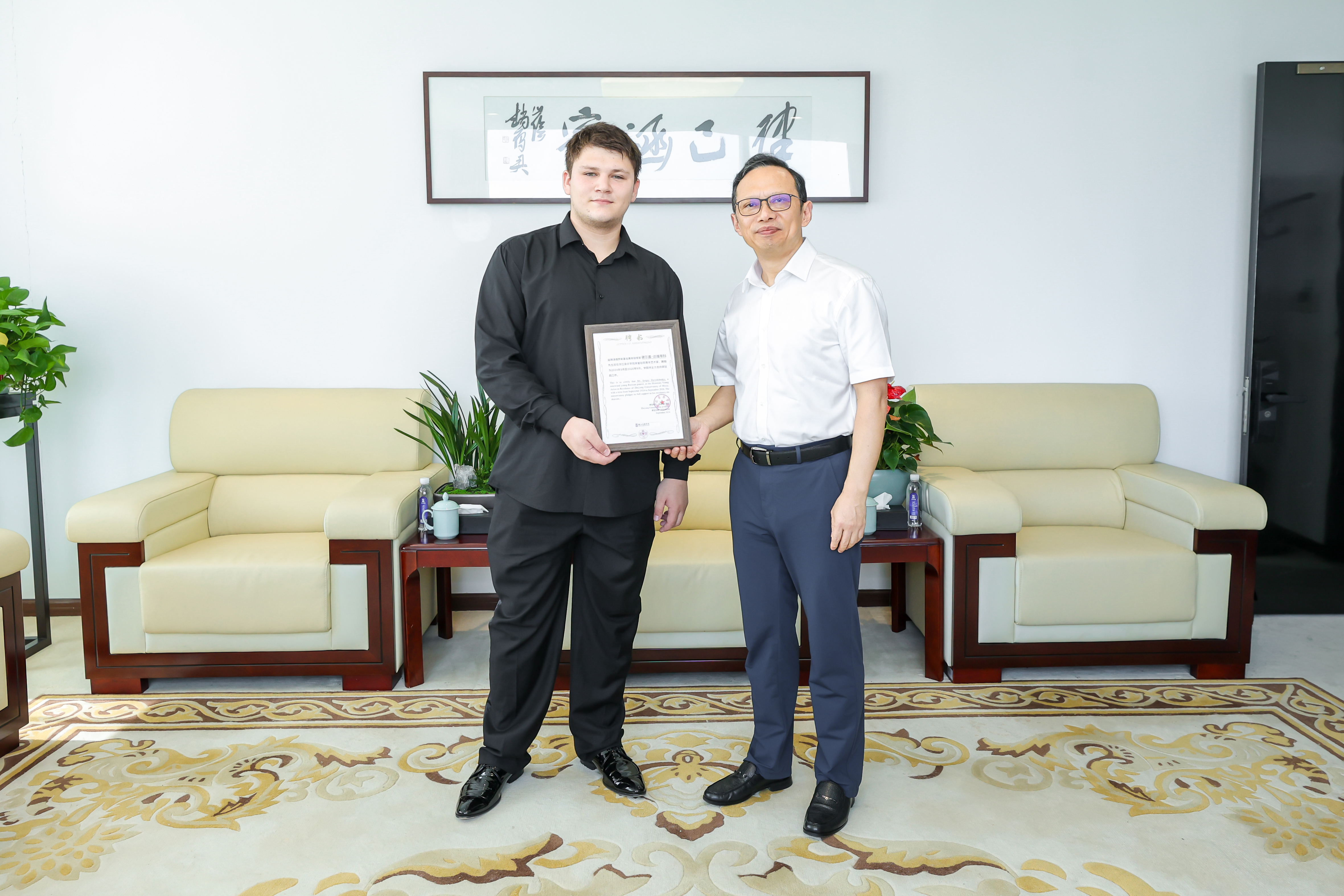 王瑞代表学校为谢尔盖·达维琴科颁发荣誉驻院青年艺术家证书。
