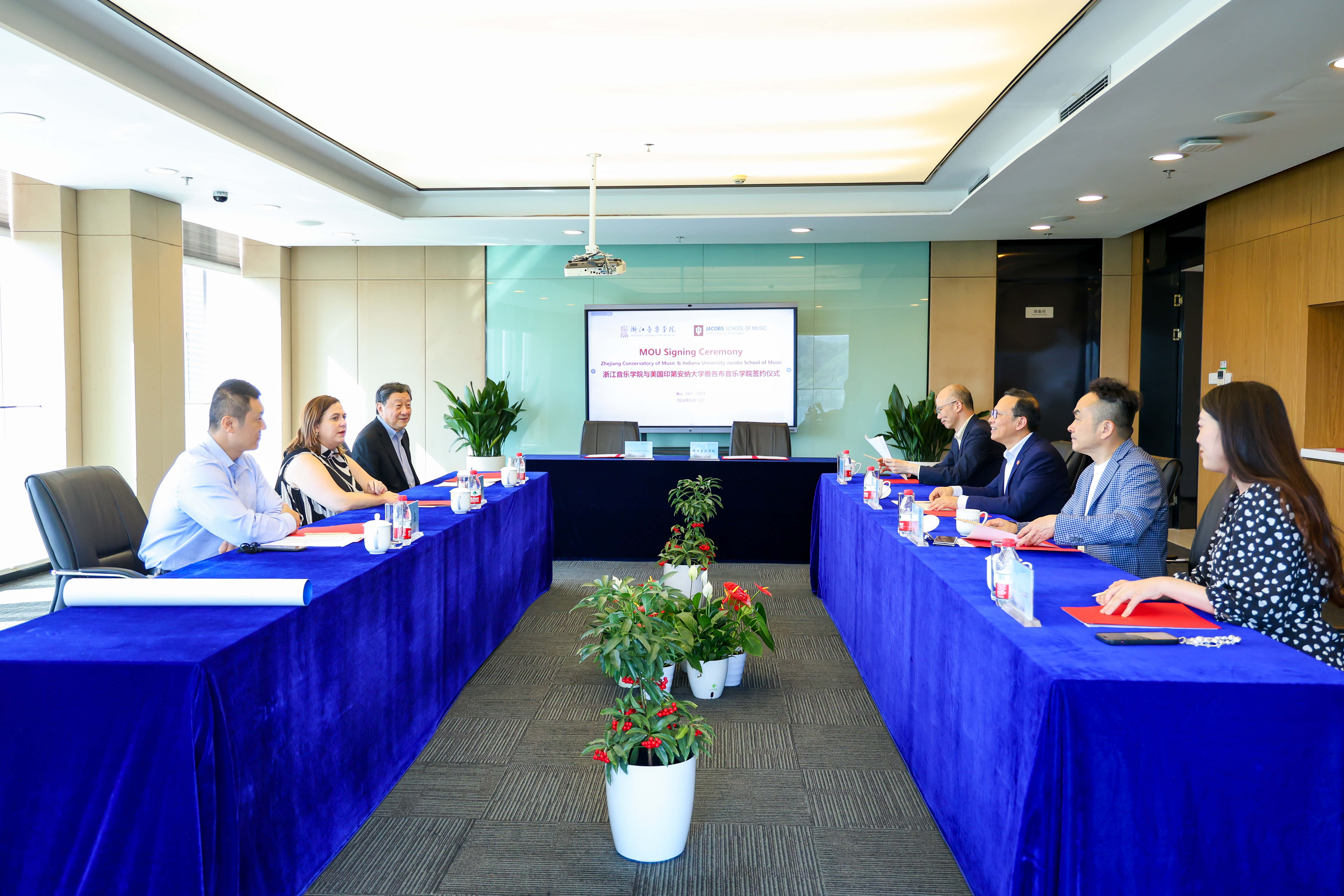 王瑞首先对布什院长的访问表示热烈欢迎,并向布什院长简要介绍浙音办学特色和近年发展情况。他表示布什院长此行是两院前期合作关系的美好延续,前期的线上交流为校际合作奠定良好基础,去年印第安纳大学协理副校长以及帕西菲克弦乐四重奏的来访更为两校开展务实全面合作创造了良好条件,希望两校在未来不断深化合作,共同探索校际合作新模式。