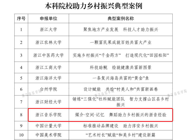 此次也是我校继2023年申报《“文艺轻骑兵”将优质文化资源引入乡村点亮文化共富路》获批全省高校助力乡村振兴典型案例后的第二次入选。高校助力乡村振兴典型案例评选活动,是浙江省教育系统贯彻落实习近平总书记关于乡村振兴的重要指示精神和二十届三中全会精神,统筹推进乡村教育振兴和教育振兴乡村,依托高校助力乡村振兴联盟实施的重点工程。活动面向全省本科院校和高职院校,总结交流推广高校帮扶工作的成功案例、典型做法和创新经验,旨在加快打造高校助力乡村振兴的浙江样板。