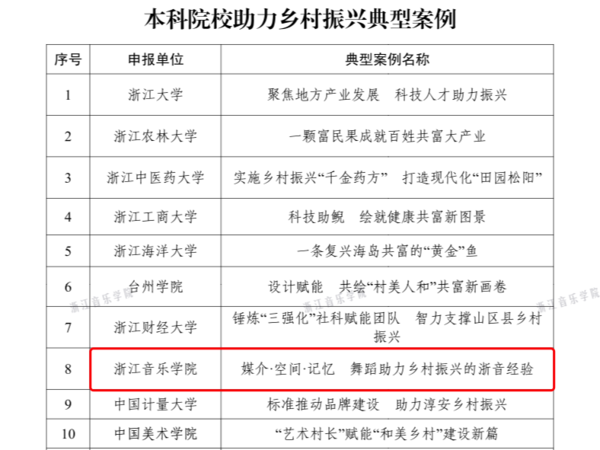 近日,我校报送的《打造“精神共富联合体”,以文化之力助推共同富裕浙江先行》案例入选全省首批教育助力高质量发展建设共同富裕示范区典型案例;《媒介·空间·记忆:舞蹈助力乡村振兴的浙音经验》案例入选第三届高校助力乡村振兴典型案例。
