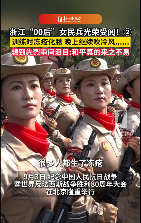 杭州综合频道:浙江“#00后 ”#女民兵 光荣受阅!②训练时冻疮晒化脓,晚上继续吹冷风......想到先烈瞬间泪目:和平真的来之不易 #杭州 #抗战胜利80周年 #九三阅兵