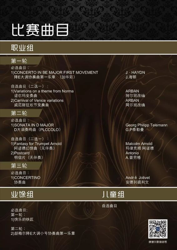 此次比赛所需所有组别小号独奏乐谱/钢琴伴奏谱,必须使用由组委会指定版本(详见指定报名网站)