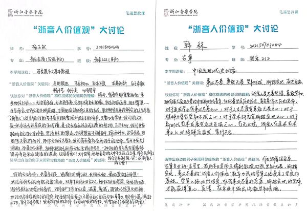 按照学院动员发动和集中研讨的阶段性要求,全体思政课教师认真学习习近平总书记关于教育重要论述,深刻领会总书记对文化文艺工作的重要指示精神等,充分了解“浙音人价值观”大讨论的意义,以结合教材、融入课堂的方式,引导学生开展广泛深入讨论,并创新性地以“笔端思政课”为载体,让学生将对“浙音人价值观”的感悟和感受运于笔端。在讨论中,“事必尽善”“德艺双馨”“不忘初心”“尽善尽美”“立于德、精于艺、创于美”等是高频词汇,充分展示了浙音学子的精神面貌。目前,“浙音人价值观”大讨论在思政课教学中实现了全员参与、全员讨论,累计1300多名学生参与。
