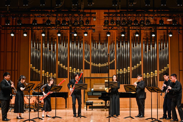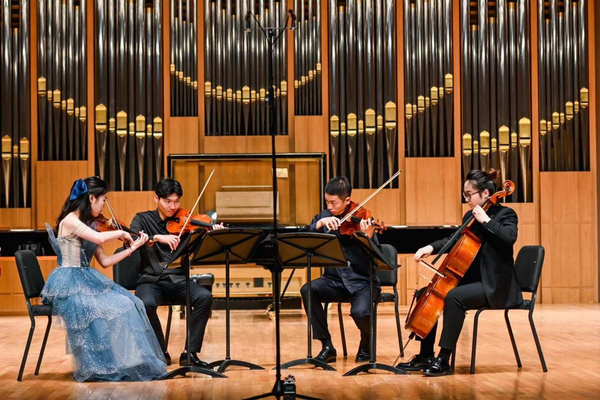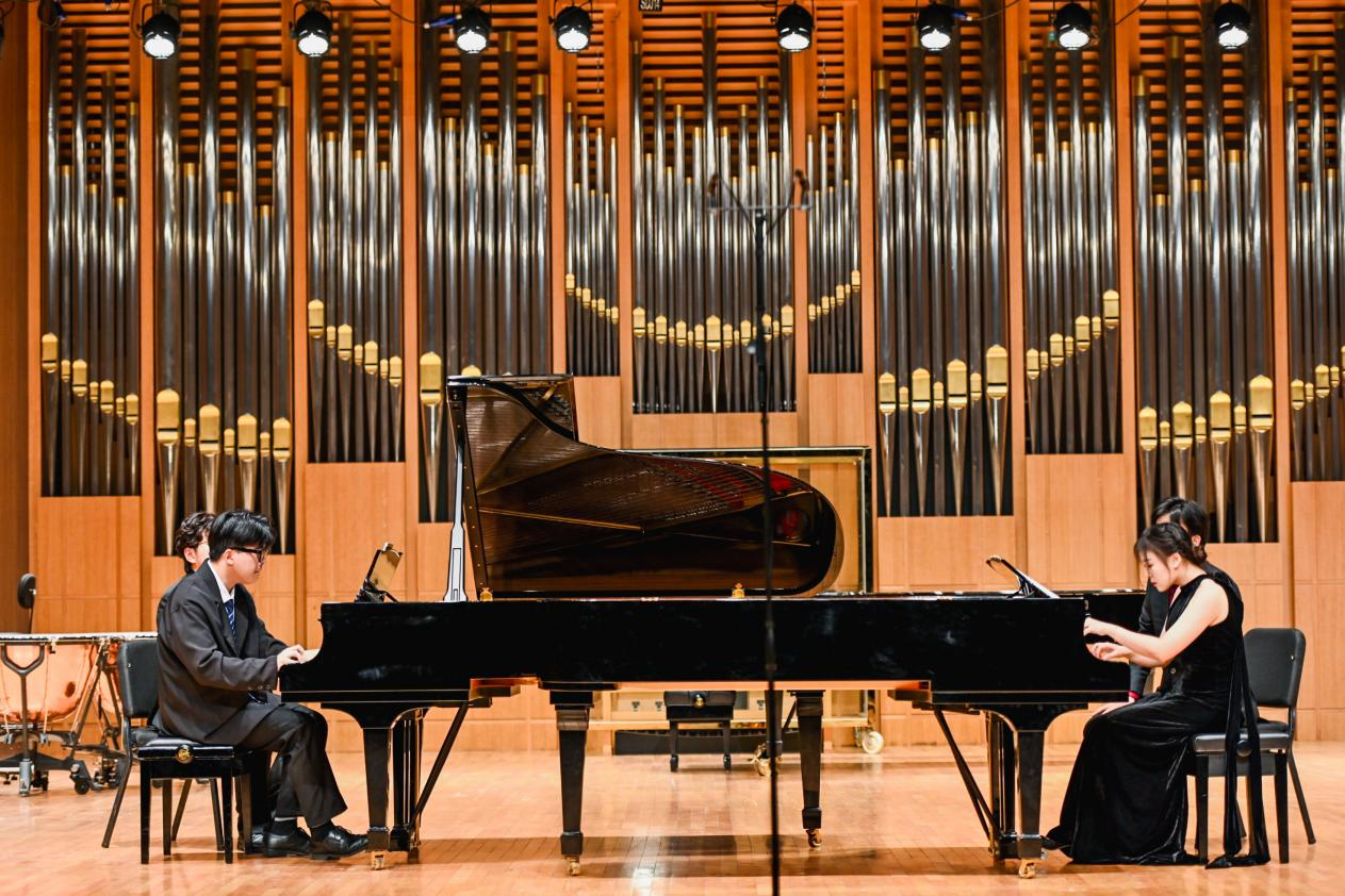 在随后举办的音乐会上,开场的木管八重奏《莫扎特c小调小夜曲》奠定了整场音乐会的高雅基调,巴洛克时期音乐的饱满和活泼在这首小夜曲中得到了充分的体现。接下来的《F大调弦乐四重奏》是贝多芬早期创作的代表作品之一,轻盈纤细的小提琴、甜美甘醇的中提琴与浑厚低沉的大提琴交相辉映,相互烘托出平衡、饱满的音响。两首双钢琴作品——米约的《丑角》和卢托斯瓦夫斯基的《帕格尼尼变奏曲》将音乐会的气氛推向了高潮。《丑角》融合了多种音乐表达方式和风格,既典雅精致又展现了拉丁美洲的异国情调。《帕格尼尼变奏曲》是卢托斯瓦夫斯基于1941年创作的双钢琴作品,两位演奏同学以扎实的基本功、精湛的演奏技巧、细腻的情感表达,在独立与统一、和谐与对比中,凸显了作品的魅力。德拉诺夫的《高贵的沙龙音乐》仿佛把听众们带回到20世纪欧洲的高雅舞会中。音乐会在旋律优美,富有浓厚的民族风情的德沃夏克《降E大调钢琴四重奏》第四乐章中落下帷幕。