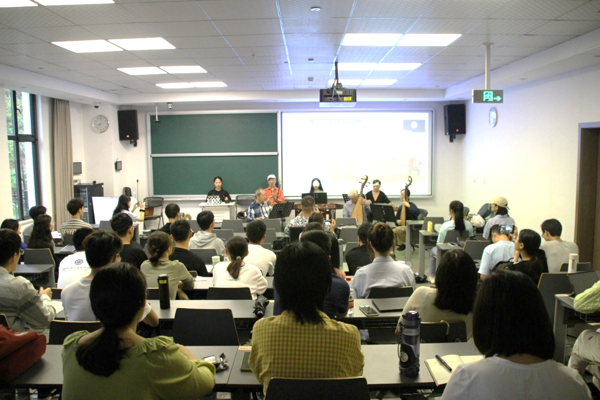 本次活动特邀杭州金朝晖江南丝竹社的4位传承人顾骏、王宗祥、齐碧君、贾培源进行演奏。平均年龄为82岁高龄的他们,与学院音乐学系、戏剧系两位同学一起,即兴演奏了《中花六板》(《薰风曲》)作为开场。随后,由学院音乐学系研究生、国科大杭高院硕士生研究生组成的第一小组围绕“江南丝竹”主题,合作展开《一曲清音话江南——杭州金朝晖江南丝竹乐社、乐人、乐事》学术交流。她们分别从江南丝竹及乐社历史、音乐风格及代表曲目、江南丝竹音乐特征三部分讲述,带领大家学习了《老六板》的工尺谱韵唱,并展示了江南丝竹的即兴手法。最后,音乐学系党总支副书记方振宇作为学术季第一场评议人,讲述了江南丝竹传承的意义,以及年轻人对非遗传承发展起到的重要作用。中科院高能物理研究所副研究员赵甲亭、环境学院副教授朱娜丽、国科大公共课教师高迪、物理与光电学院党总支书记亓洪兴等都畅谈了传承弘扬中华优秀传统文化的重要意义。他们表示,浙音师生以合作交流学术季的形式走进杭高院的课堂教学,能够让理工科学生在潜移默化中受到传统文化的滋润,无形中为坚定文化自信奠定了基础。在尾声中,活动嘉宾以一曲《春江花月夜》为本次活动划上了终止符。
