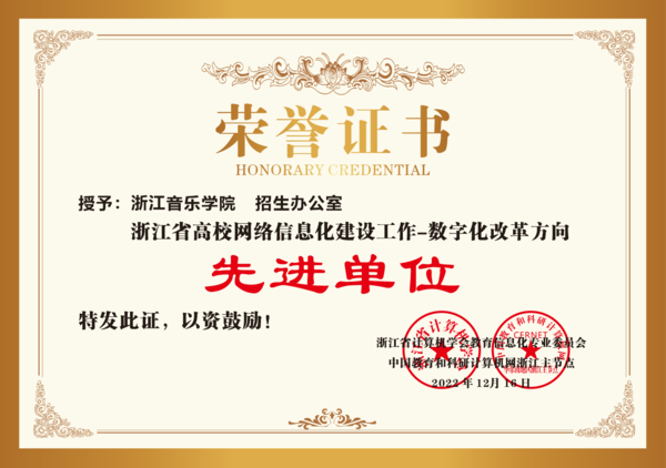 近日,浙江省计算机学会教育信息化专业委员会、中国教育和科研计算机网浙江省主节点联合评审出2022年浙江高校网络信息化建设先进单位和先进个人,学院艺术处、招生办公室分别荣获浙江省高校网络信息化建设工作先进单位-数字化改革方向,信息技术中心荣获浙江省高校网络信息化建设工作先进单位-网络安全方向。姚逸仙同志被评为浙江省高校网络信息化建设工作先进个人。
