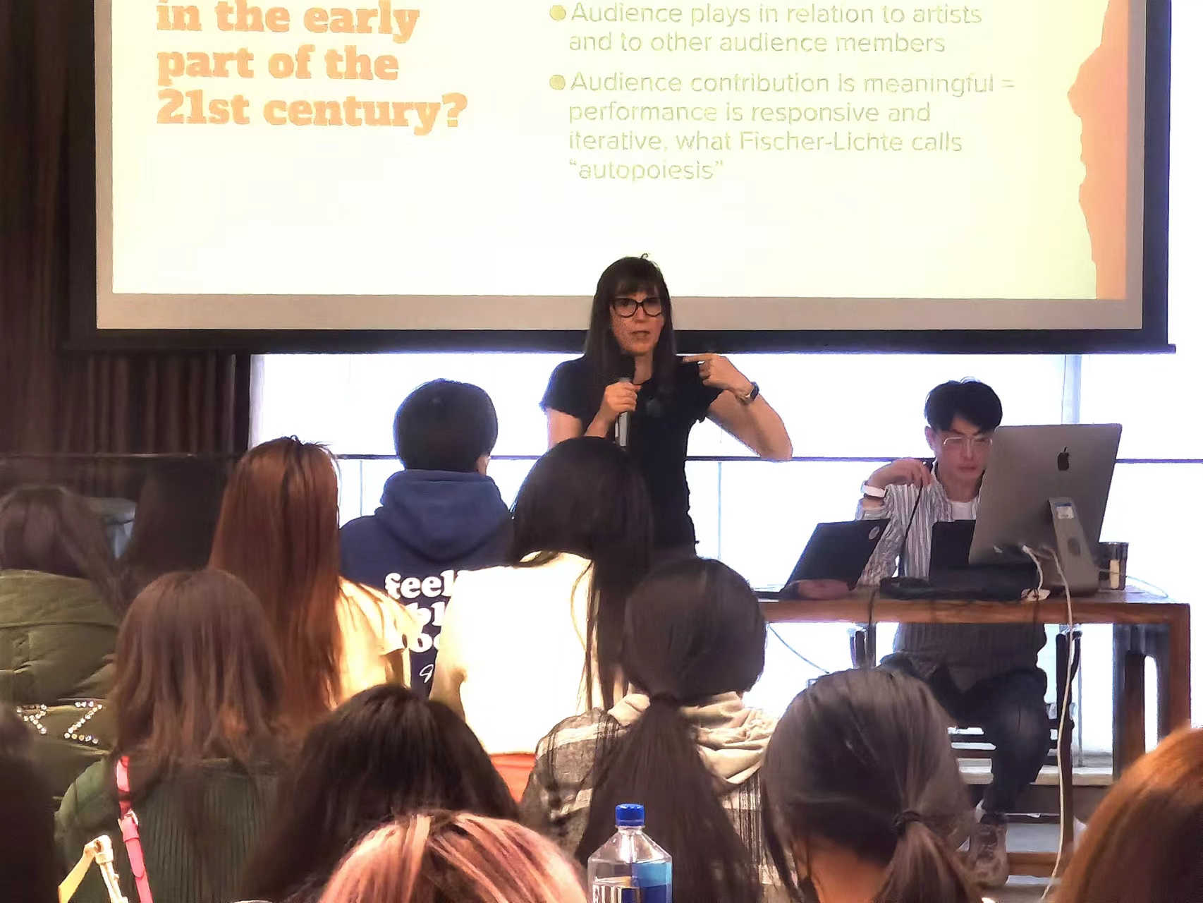 讲座期间,史蒂芬森教授向戏剧系师生介绍其学术团队近十年来收集、整理、调研的“参与式戏剧”项目的相关成果和议题,在分析20世纪“社会介入式艺术”的总体特征后,她对加拿大疫情时代“参与式戏剧”戏剧构作的展开方式和参与范畴进行新的分析和定义,并以切身经历的多种“参与式戏剧”展演案例,向师生们介绍“参与式戏剧”作为一种关系美学范畴下的个性化体验,以及一种新的戏剧形态所独具的时代属性与深刻含义。在随后的互动提问环节,同学们与斯蒂芬森教授针对疫情时代的戏剧走向、线上音乐剧发展等话题展开了热烈的交流。