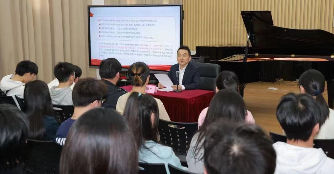董德君在党课中指出“德艺双馨”,德在先,学艺先做人,在做到德的同时,也要追求专业的能力,从而实现人生的价值。他以党的二十大报告中的关键词、习近平总书记对青年的期望、浙音人的使命等几个方面展开,讲述了一堂充满思想与音乐文化的思政课,激发了浙音学子追求更高音乐造诣。他强调,我们要牢记习近平总书记对新时代青年的殷殷嘱托,要做有理想、敢担当、能吃苦、肯奋斗的新时代好青年。大家不仅要有远大的理想,担当的意识,更要练就过硬的本领。“事必尽善”是浙音的校训,“弘毅尚德、博约精艺”是浙音价值理念,作为将来的文艺工作者,我们要以继承弘扬民族优秀传统文化,发展传播中国艺术为己任、磨砺技艺、精益求精,为人民抒写、为人民抒情、为人民抒怀,打造思想、精神、艺术精湛、制作精良的精品力作,塑造具有炽热的家国情怀、深厚的文化底蕴、扎实的艺术功底和艺术成果的时代新人。他表示,作为省属唯一音乐艺术本科高校,浙音自觉肩负起服务文化强省的使命意识和责任意识,围绕“两个先行”奋斗目标,“八个高地”具体目标和“十个着力”主要任务,打造文化人才积聚平台、建立文化艺术品牌、推动文艺精品创作,以高质量文化供给不断增强人民精神文化生活的获得感和幸福感。最后,他希望我们要以德艺双馨为目标,心中有阳光,脚下有力量,用青春书写新时代荣光,用实际行动实现人生价值。