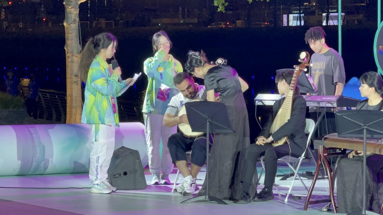 此次演出涵盖民族乐器竹笛、二胡、古筝、笙、中阮、琵琶,以及流行乐器电吉他、贝斯、键盘、架子鼓等。 音乐会由一首轻松欢快的《喜洋洋》,此次杜竹松团队将对原有乐曲进行改编,使民乐与电声乐队相结合,向国内外运动员展现出更加热情洋溢、充满喜庆氛围的乐曲。随后,乐队演奏了一首极具杭州韵味、观众耳熟能详的《人间西湖》,通过热情洋溢、耳目一新的演奏,向台下的观众们展现了杭州西湖的梦幻与美丽。两首不同风格的乐曲演奏结束之后,师生们向大家先后介绍了中国传统民族乐器——古筝和中阮,并与台下观众互动,吸引许多观众上台一试。