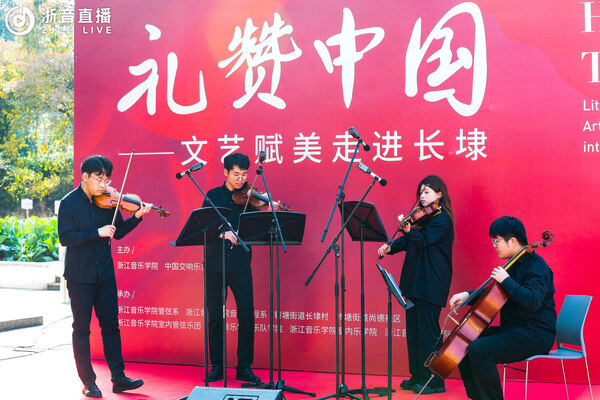伴随长埭村村民热情的掌声,由张贺中、吉雅图、丁玉璇、李长威四位同学组成的弦乐四重奏率先为大家带来莫扎特最著名的《G大调弦乐小夜曲》,拉开了音乐会的帷幕。活泼流畅的节奏和短促华丽的八分音符颤音组成欢乐的旋律,一出场就点燃了现场的气氛。第二首演奏的是《启航随想曲》,该曲旋律歌唱性强,内涵简单易懂,纯正细腻且扣人心弦,在弦乐四重奏精彩演绎下,让观众在美妙的音乐声中无限遐想。曲风一转,弦乐四重奏带来陕北信天游的代表曲目之一《兰花花》,淳朴生动、犀利有力的演绎,充分展现了不畏社会压迫、敢于为爱情作斗争的坚强女性形象。弦乐四重奏组合以《我和我的祖国》作为结尾,这首耳熟能详的歌曲顿时让在场观众热血沸腾,让大家再次深感身为中国人的自豪与骄傲。