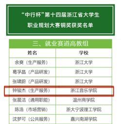 近日,浙江省大学生创新创业大赛组委会公布第十四届浙江省大学生职业规划大赛获奖名单,音乐工程系学生钟骏杰获得“就业赛道高教组”铜奖。