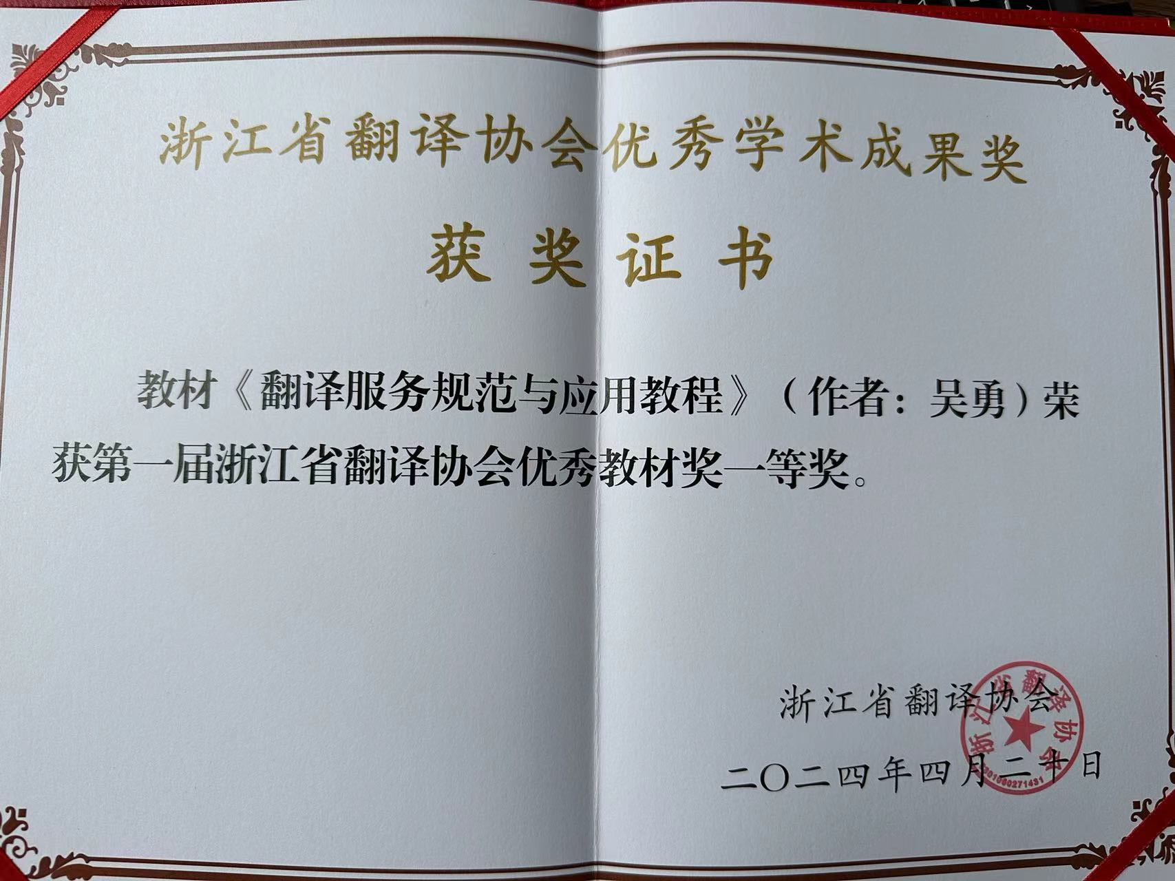 近日,浙江省翻译协会公布第一届“浙江省翻译协会优秀学术成果奖”获奖名单,其中,人文社科部吴勇教授编著教材《《翻译服务规范与应用教程》》荣获教材类优秀成果奖一等奖。