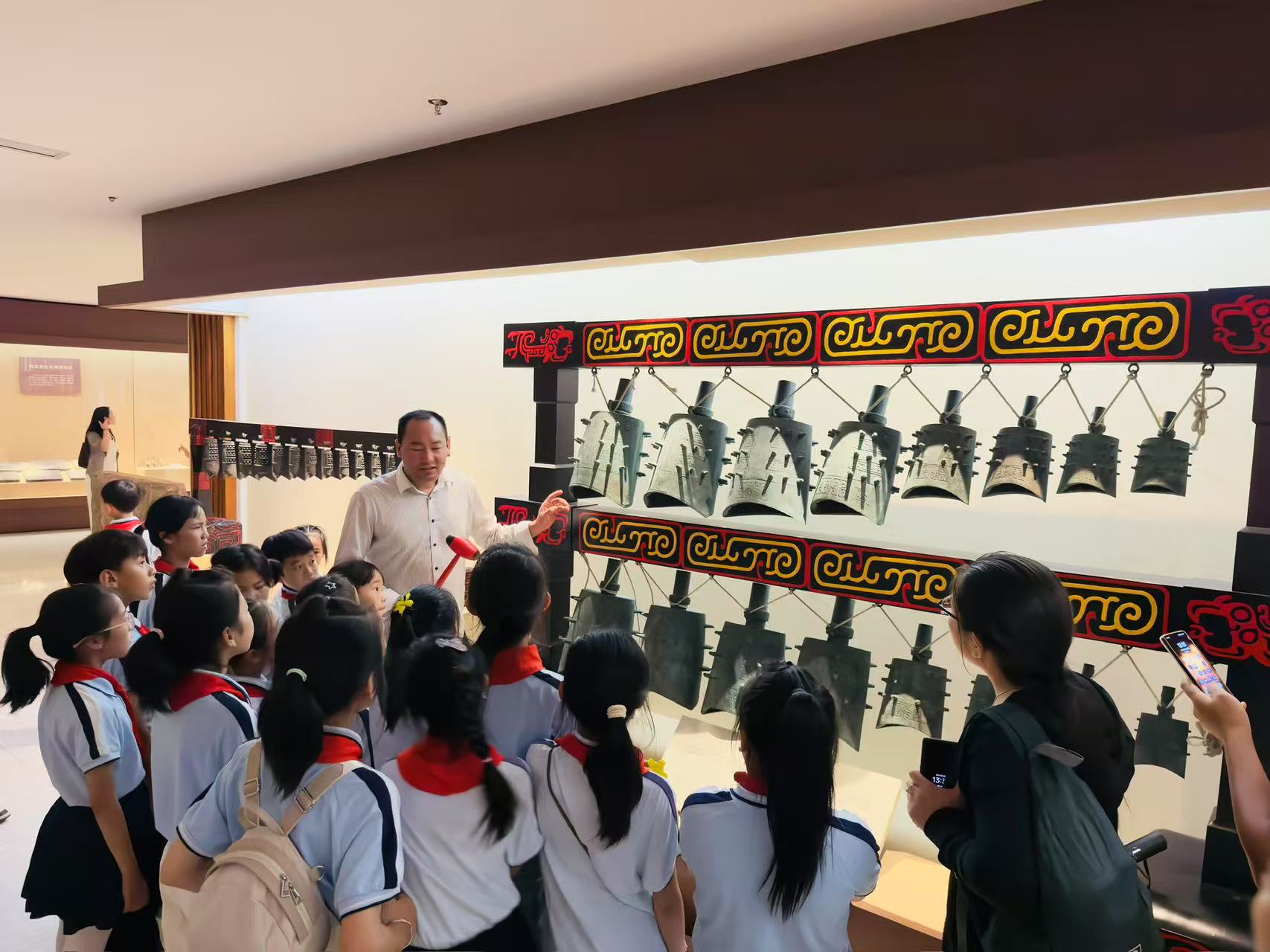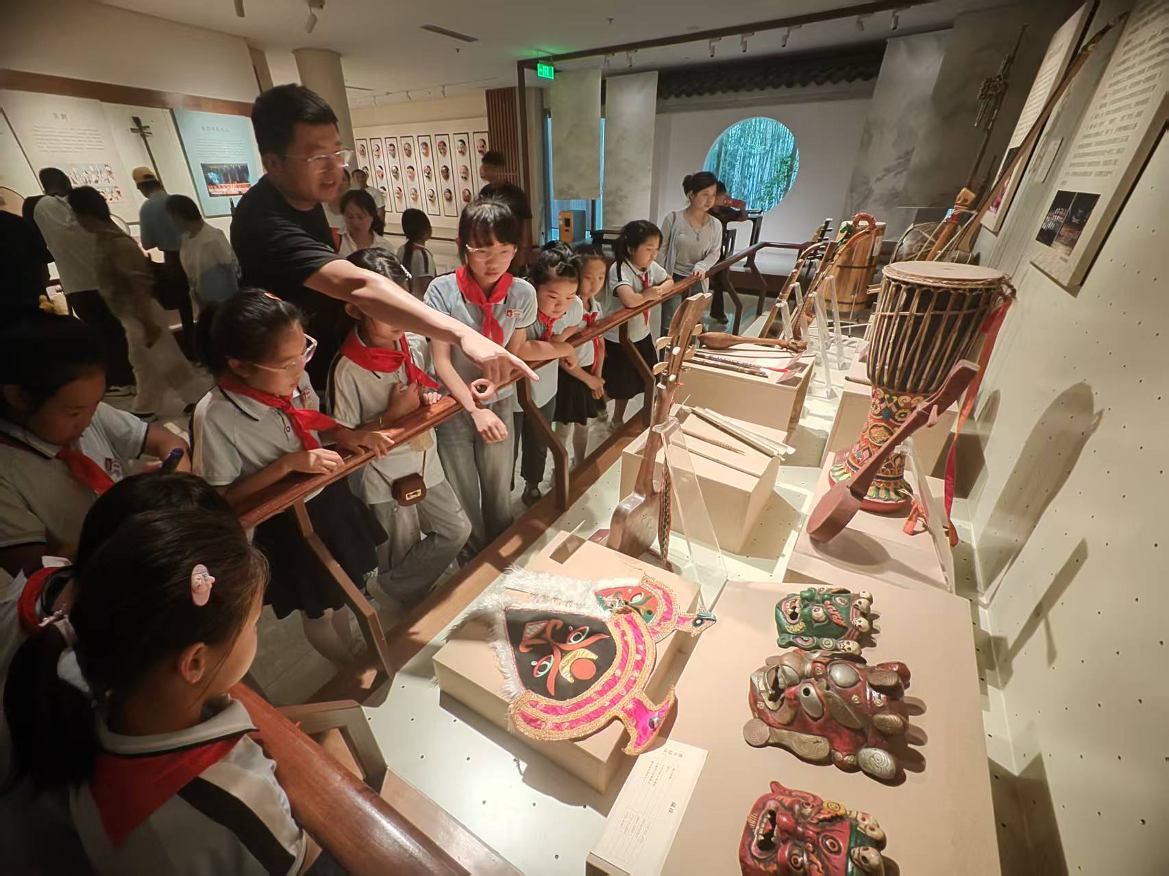 在浙音之窗,孩子们在大学生志愿者的讲解下,详细了解了学院的建设发展历程、学科专业设置和办学特色亮点等;而音乐博物馆之旅更让孩子们眼界大开,古今中外各色乐器,仿佛为他们打开了新世界的大门——在学院文化特派员冯宇光的讲解下,大家不仅了解了各种乐器的特点,更感受到中国传统文化的独特魅力。孩子们还敲响了典雅庄重的战国编钟,触摸华丽精美的纹饰、聆听穿越历史的声音,不由赞叹古人的智慧,感受到中华音乐文化的博大精深。