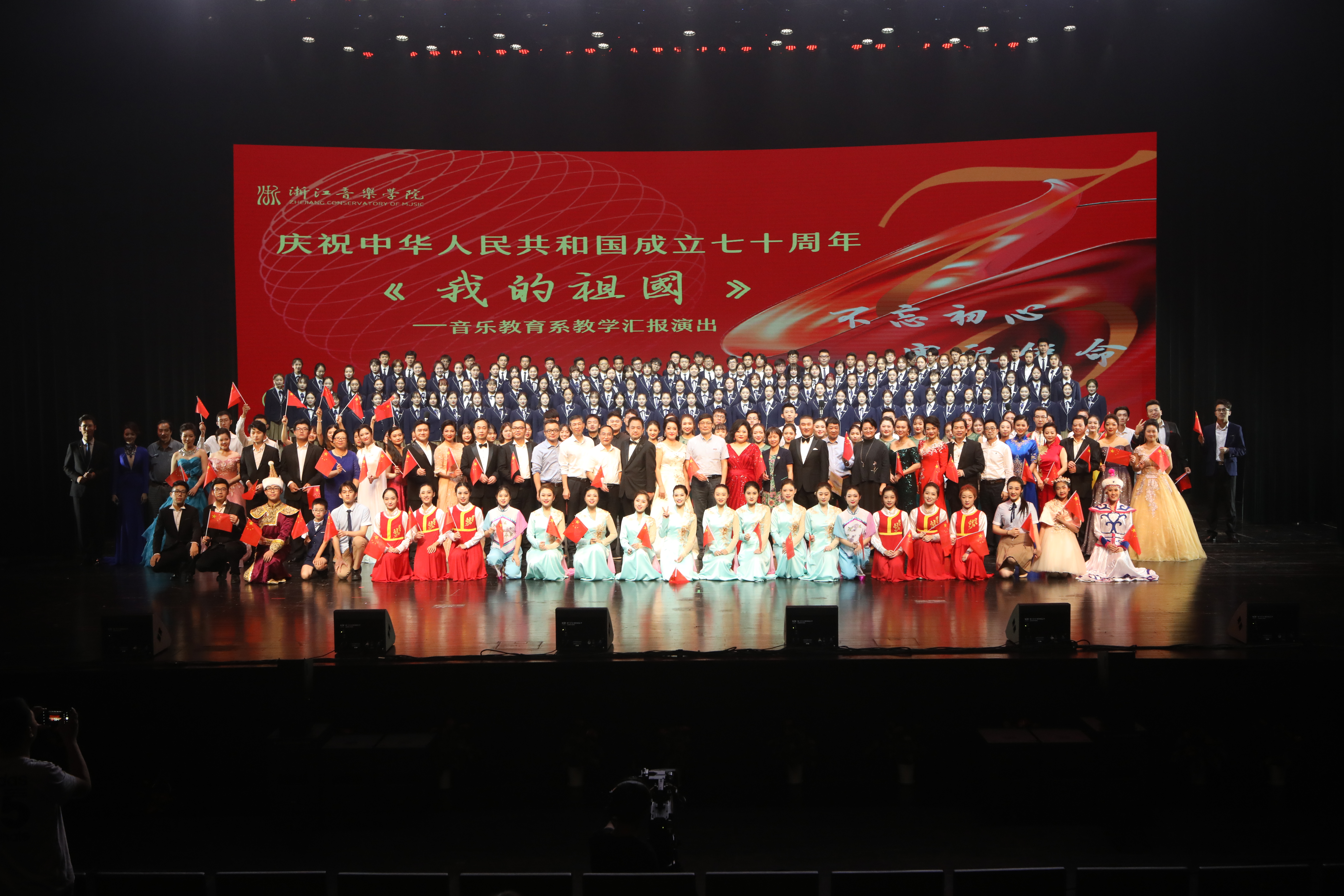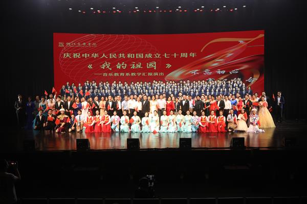 在全院上下扎实开展“不忘初心、牢记使命”主题教育之际,9月20日晚,我院音乐教育系主办的庆祝中华人民共和国成立70周年——《我的祖国》大型主题歌舞晚会在大剧院隆重举行,晚会集中展示了音乐教育系教书育人和立德树人新成果,用思想深邃、艺术精湛的文艺精品进行了红色洗礼。学院党委书记胡建新、党委副书记贾秀英,党政办公室、党委组织部、党委学工部、教务处等部门负责人,以及2019级全体新生、音乐教育系全体师生等近800人观看了演出。