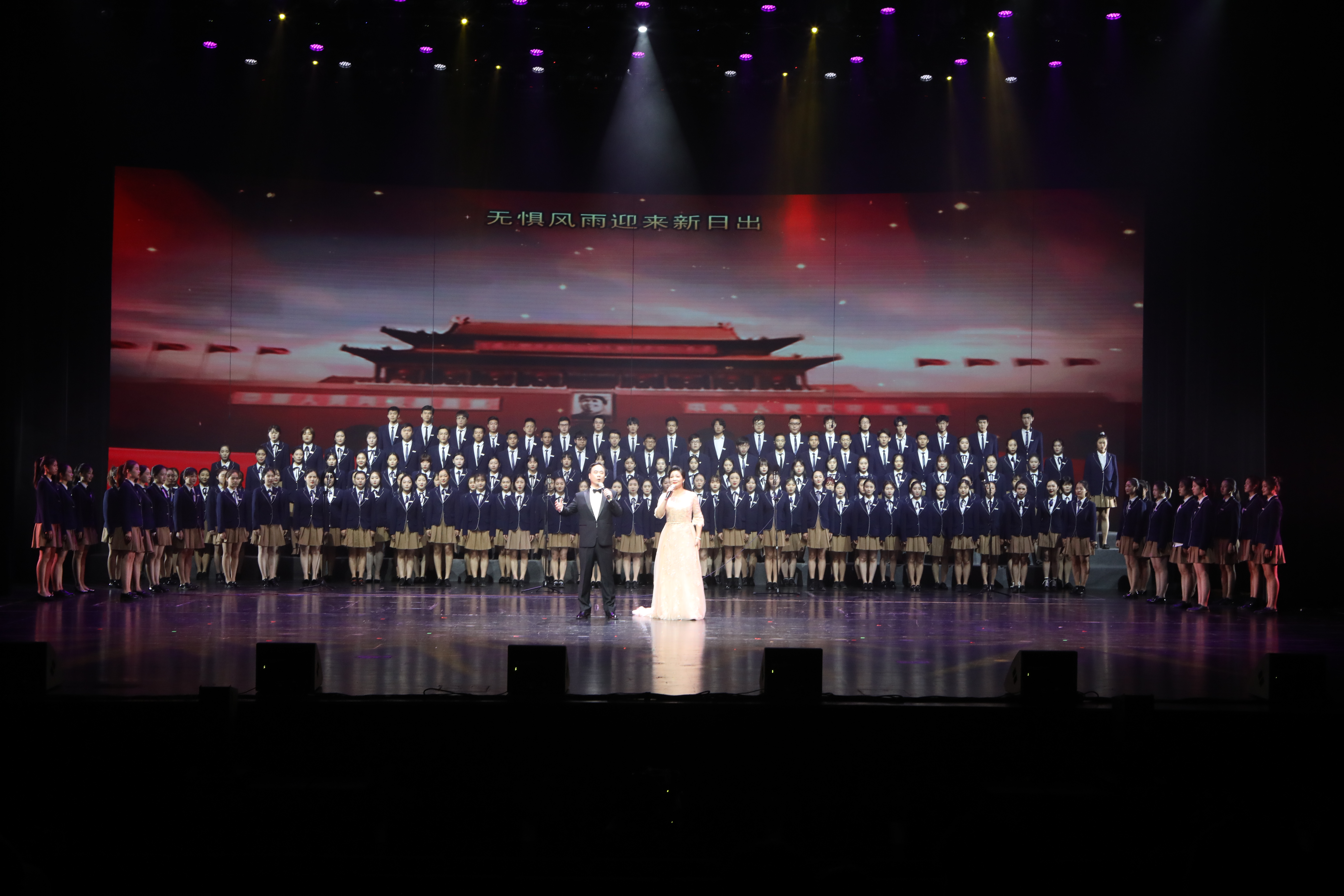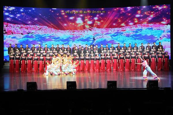 汇报演出以党员教师金奇创作的三首作品为主线串联,形成浑然一体的三个篇章,追忆中华民族从站起来、富起来到强起来的伟大飞跃,赞美新中国七十年来的奋斗历程、沧桑巨变、辉煌成就,进一步激励广大师生奋进新时代、阔步新征程,展望实现中华民族伟大复兴的光明前景。