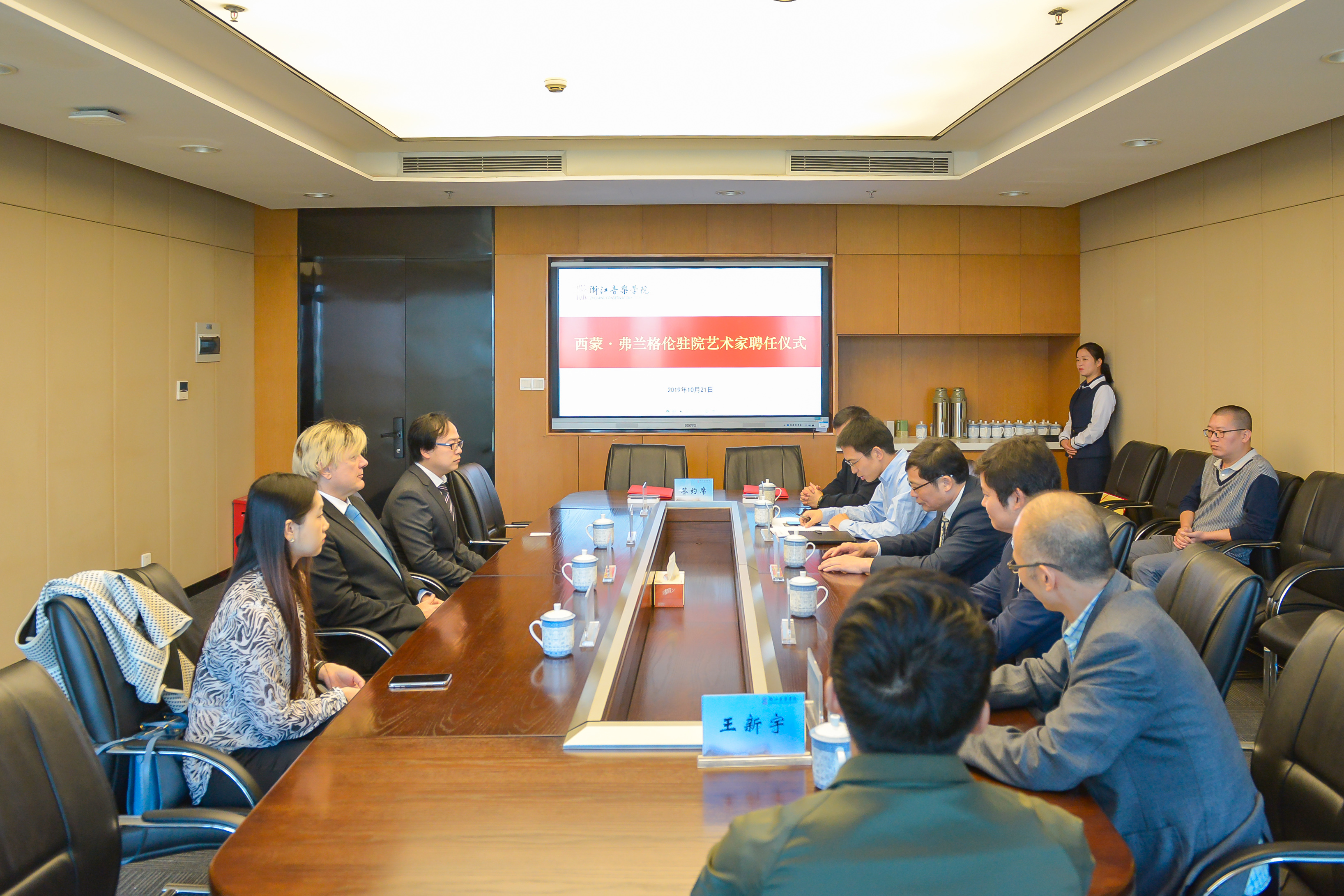 10月21日上午,世界级音乐大师西蒙•弗兰格伦先生签约受聘仪式在行政楼808会议室隆重举行,由此,西蒙•弗兰格伦先生正式成为我院驻院艺术家。西蒙•弗兰格伦先生,学院党委书记胡建新,党委副书记、副院长张建国,相关部门、系部负责人及教师代表等参加会议。