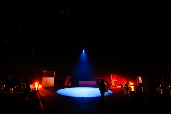 跨界作品《渔樵耕读》由舞蹈系青年教师程龙、马佳宏共同创作,作曲与指挥系张昕副教授作曲承担钢琴、打击乐的即兴演奏,上海民族乐团唐一雯担任中阮即兴演奏,舞蹈系学生陈秀豪、刘雅婷、乐欢、傅川等19人为即兴舞者。演出在一个可塑性极强的实验剧场进行,变换的空间、移动的光影、在舞台和现实中游走的舞者、即兴创作的演奏者和哲理性视频的跨界综合呈现,给观众带来了一场极富冲击力的视听盛宴。