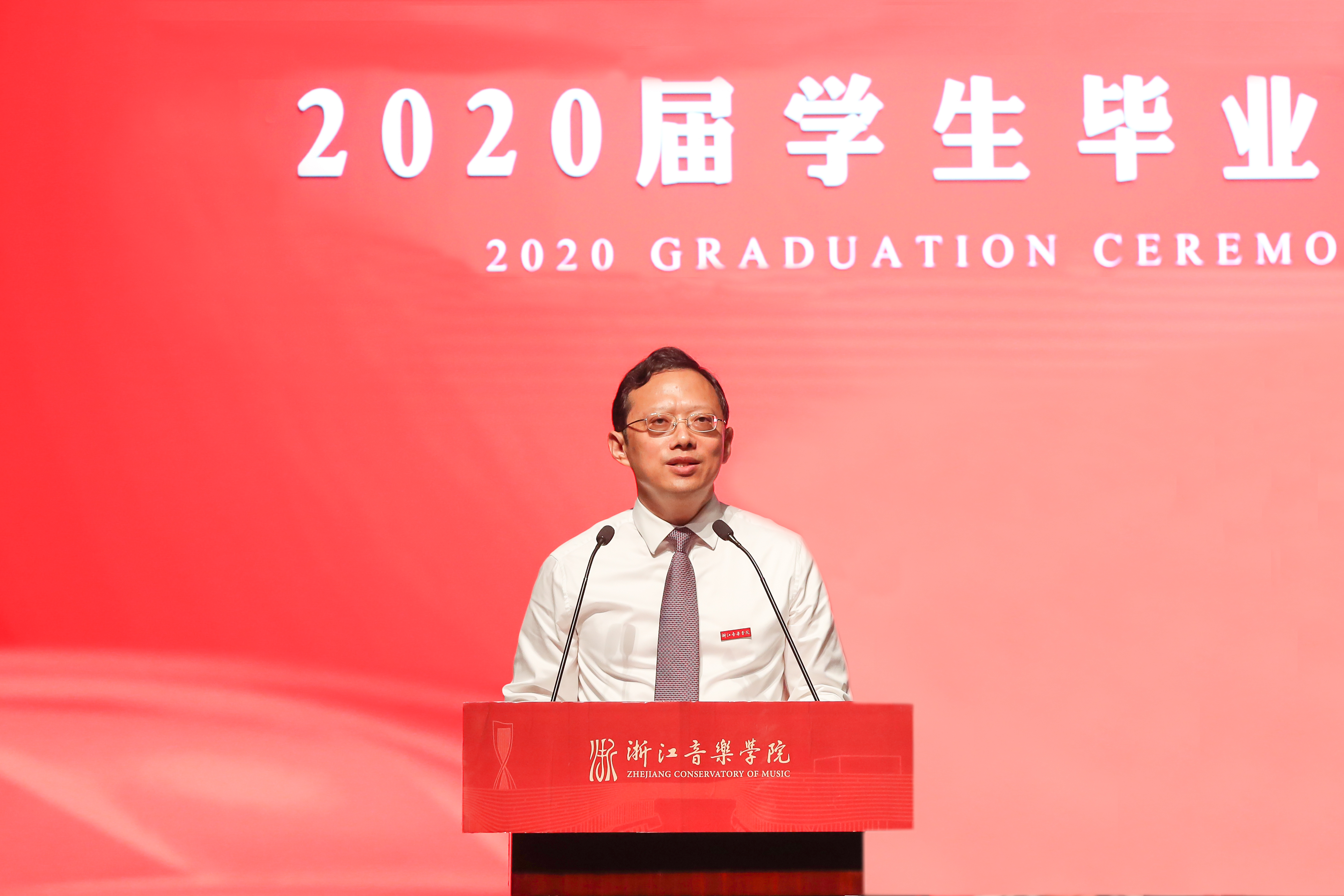 学院院长王瑞为全体毕业生献上深情寄语“做有理想有情怀有担当的浙音人”。他指出,2020年是不平凡的一年。短短数月,见证了中国人民抗击新冠疫情所展现出的伟大民族精神和史诗般的悲壮与激越,见证了中国在突发性公共卫生危机面前的中国自信和中国力量。历史是最好的教科书。面对疫情,中国速度、中国效率、中国精神和中国力量,成为中华民族伟大精神和社会主义制度优越性的鲜明写照。在疫情肆虐的日子里,浙音师生创作了歌曲、民族室内乐、配乐诗朗诵等25首(部)各种体裁的艺术作品,产生了广泛、积极的社会影响,展现了浙音人应有的责任担当。他强调,文艺是时代前进的号角,是铸造灵魂的工程,文艺工作者是灵魂的工程师,如何在危机中不迷失方向,在变局中开拓新局,是每一位艺术工作者需要深入思考的命题。科学与艺术是不可分割的,二者对人类文明发展具有不可或缺的价值。越是艰难困苦,越是需要并且能够彰显艺术的无可替代的价值和强大的精神力量。中华民族伟大复兴,既需要强大的经济基础,还必须实现精神自立、文化自强、理论自觉和思想解放。希望同学们始终保持独立思考和辩证思维,坚守“为人民而歌”的艺术初心,坚定艺术自信,保持艺术的纯真纯粹,树立艺术工作者的荣誉感、使命感和责任感,自尊、自强,自省、自爱,努力肩负起人类发展和民族振兴的历史重任。面对新时代,进一步坚定理想信念,坚持“四个自信”,秉持“事必尽善”校训精神,把自己的人生理想融入到中华民族复兴的伟大事业中,在艰苦奋斗中砥砺意志、增长才干,在祖国和人民最需要的地方绽放青春光彩。