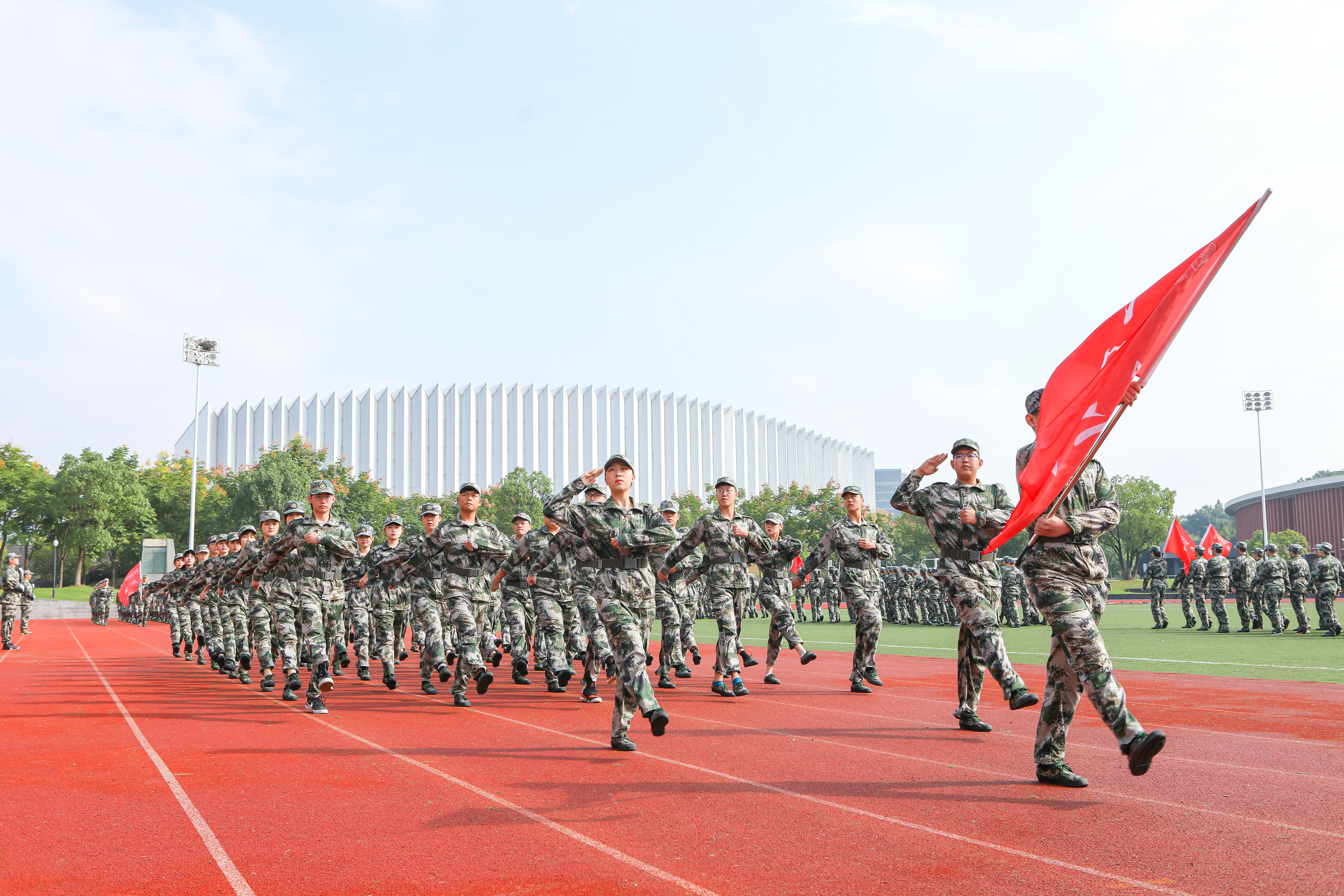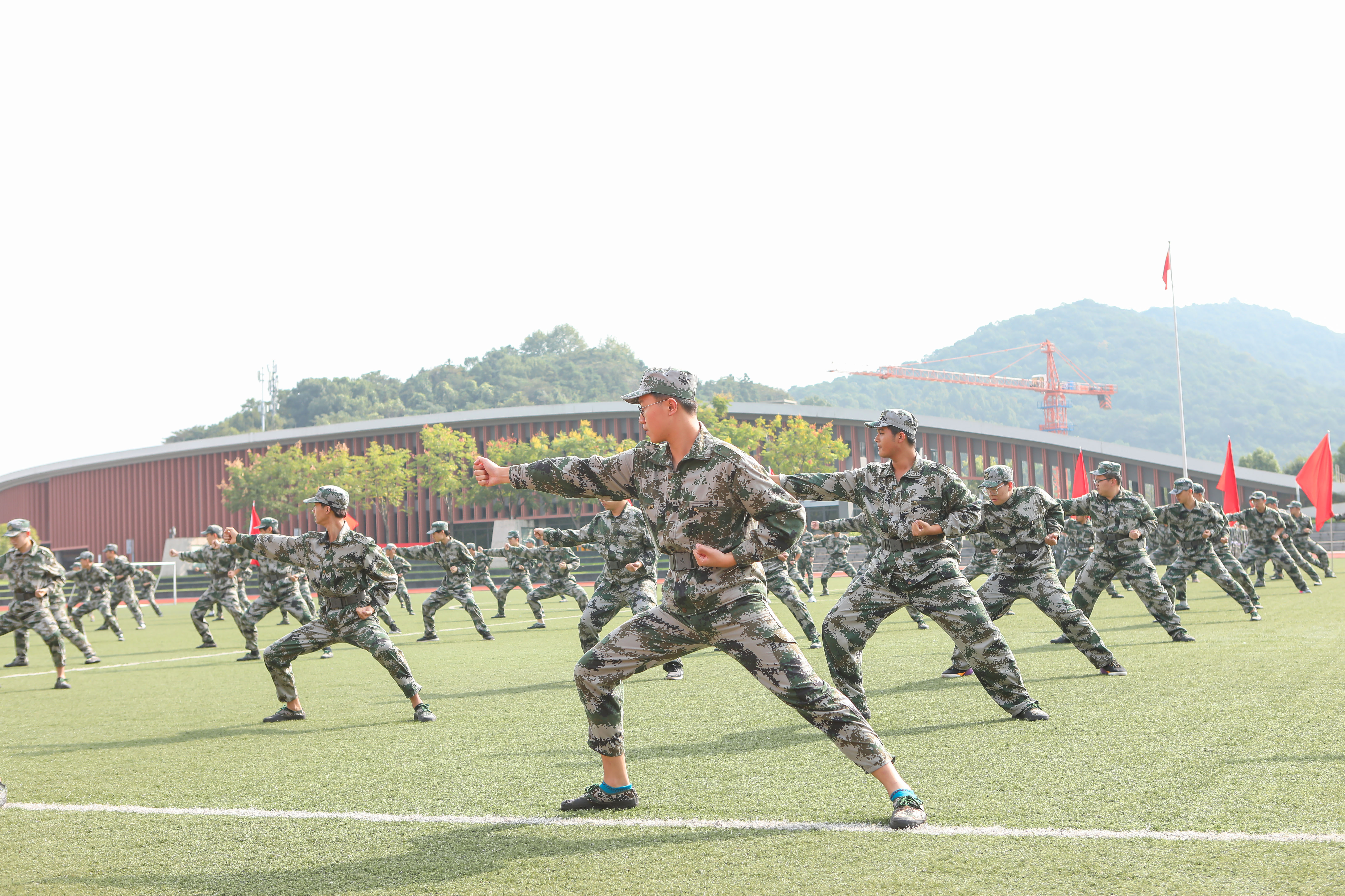 现场,参训新生迈着铿锵有力的步伐、喊着响亮的口号进行了分列式表演。整齐的动作、坚定的目光、嘹亮的口号,展现出浙音新生昂扬的风貌和过硬的素质。近200名男生进行了百人军体拳,他们将拳打、脚踢、摔倒、夺刀等格斗动作展现得淋漓尽致。近400名女生组成花样列队操,变化展示着“I love ZJCM”字体和《志成学子之歌》的手语操,整齐化一的动作、嘹亮的番号声,充分展现了年轻浙音学子们不折不挠、事必尽善的团队精神,赢得与会领导和在场观众的阵阵掌声。