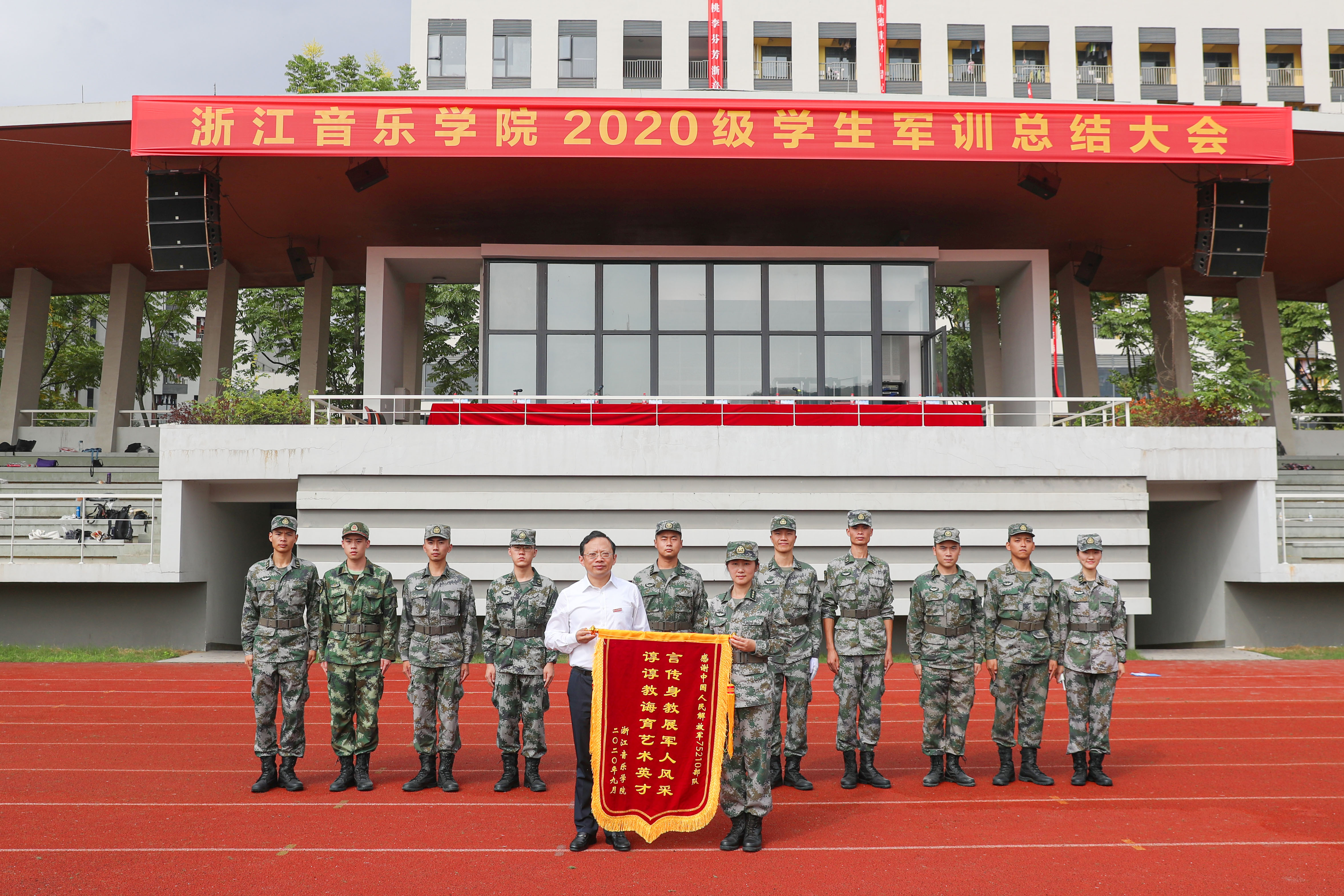 校长王瑞向承训部队赠送锦旗“言传身教展军人风采,谆谆教诲育艺术英才”,表达对承训部队军官的感谢。