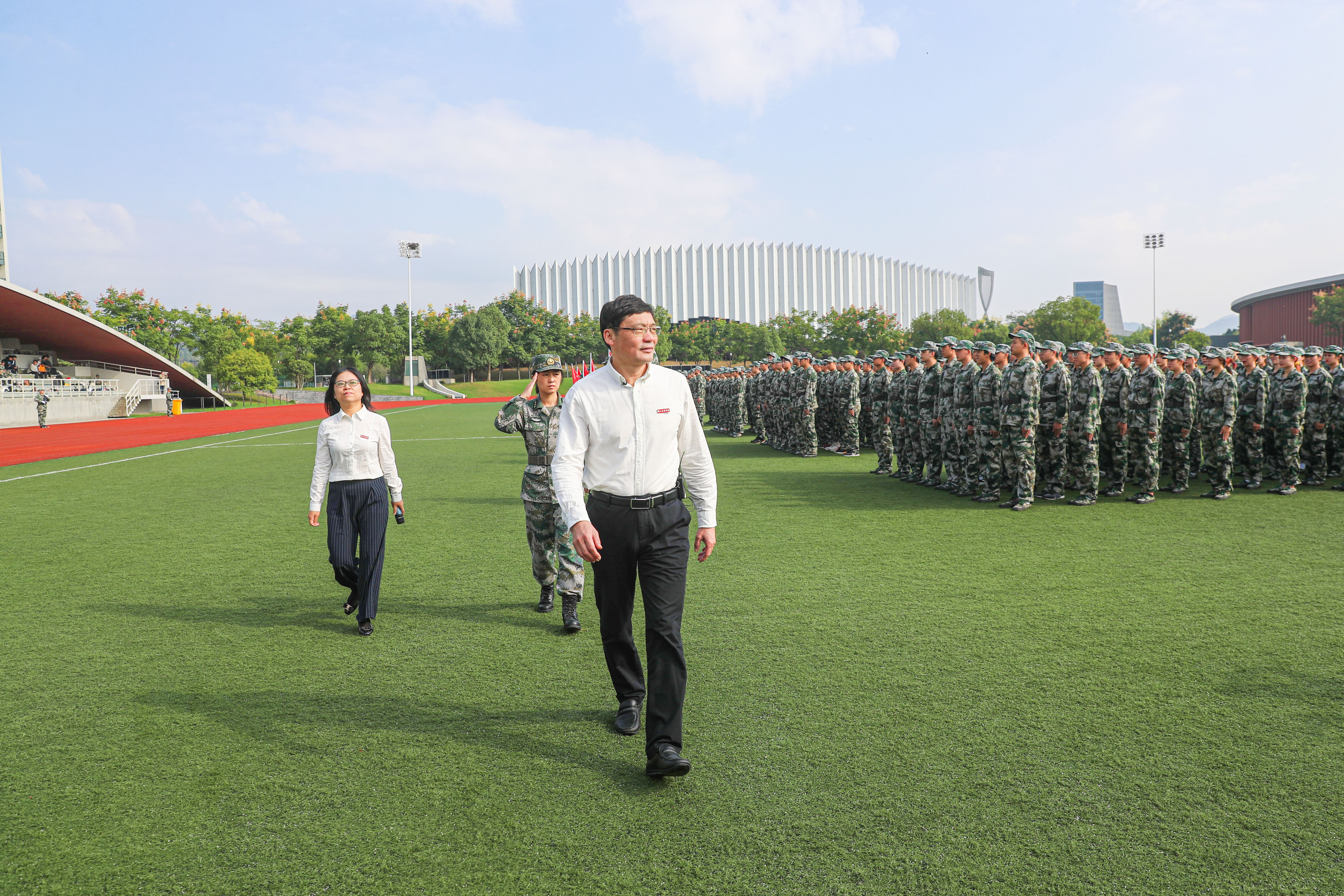 校党委书记胡建新在军训营有关负责人的陪同下检阅军训列队方阵。
