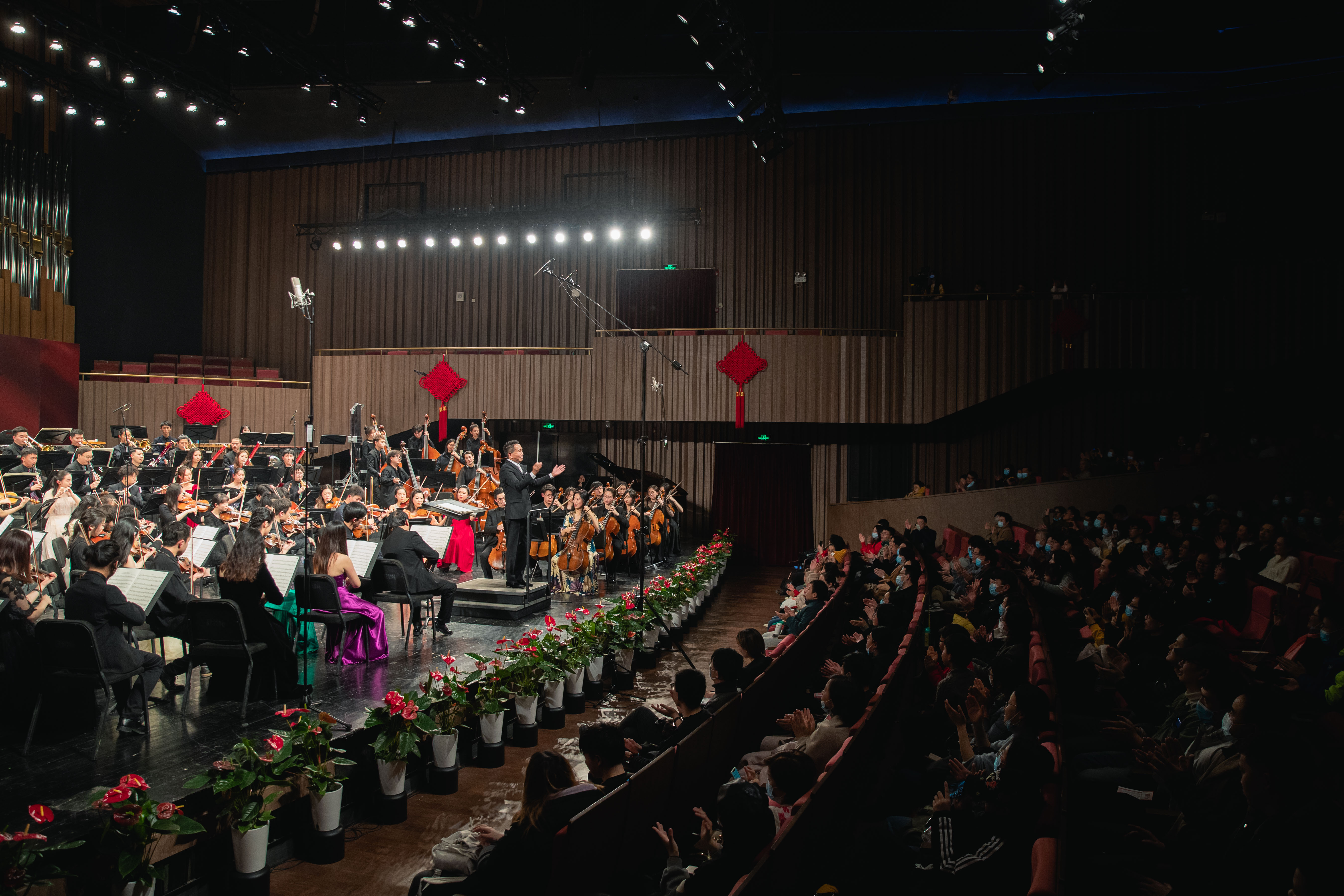 下半场,一首《节日序曲》的美妙乐声响起,胡咏言挥棒间热情澎湃,引领交响乐团精准无暇的演奏,把当晚音乐会再次燃起高潮。青年女高音歌唱家黄玮演唱《我爱你中国》,她用隽永的艺术魅力撼动着在场观众的听觉,在激情燃烧的岁月里幻醒观众最深处的感动。紧接着,交响乐团还演奏了柴可夫斯基抒情华丽的《花之圆舞曲》,马斯卡尼豪放热情的《间奏曲》和约翰·施特劳斯醉人心脾的《蓝色多瑙河圆舞曲》,默契的配合,精彩的演绎将交响乐的浪漫唯美展现得淋漓尽致。音乐会以我国著名作曲家吕其明创作的交响诗《红旗颂》收尾,耳熟能详的音乐激励着广大人民昂首阔步,迈向“十四五”新征程。一曲终了,观众雷鸣般的掌声经久不息。乐团一连加演了《我和我的祖国》《拉德茨基进行曲》2首经典作品,伴随着全体观众默契配合,击掌相合,2021新年交响音乐会完美落幕。