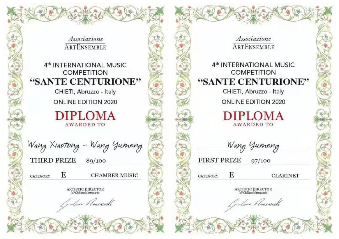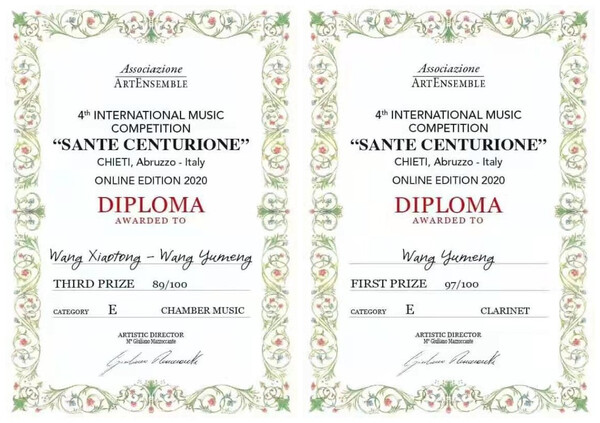 近日,在第四届“sante centurione”国际音乐比赛(线上)中,学院管弦系学生王晓通、王宇萌在董德君教授和艺术指导齐笑怡的指导下喜获佳绩。王晓通、王宇萌获得室内乐E组第三名(第一、二名空缺),王宇萌获得器乐专业E组第一名,这也是室内乐学院学生再次荣获国际比赛奖项。