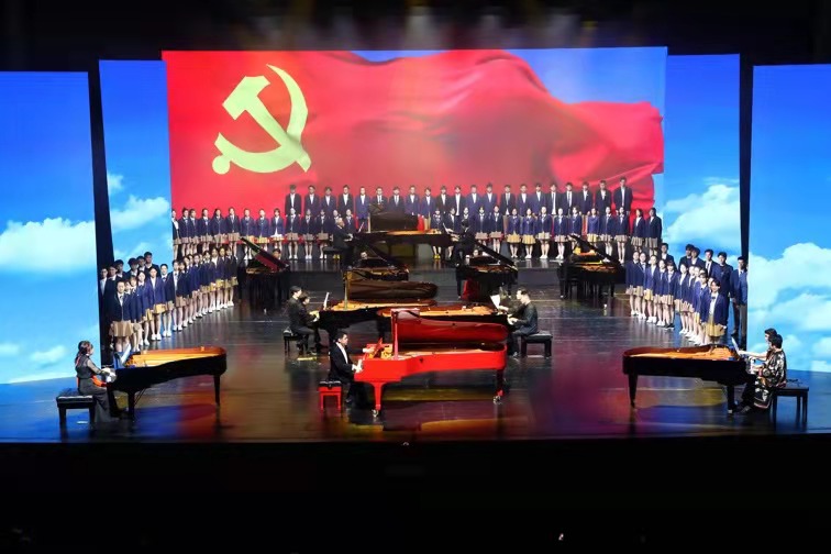 演出分为序、“觉醒的理想”“奋斗的幸福”“希望的田野”“信仰的力量”和尾声6个部分,恰似一幅长轴画卷,栩栩如生地勾勒出中国钢琴音乐百年间的渐变、融合,不断变化发展的鲜明图像。音乐会在钢琴系分类培养学员与室内乐学院学员合作的钢琴三重奏《和平进行曲》中拉开了序幕。《和平进行曲》是我国第一首公开发表的钢琴曲,演出版本由钢琴系教师周宁改编,旨在致敬中国音乐的先驱赵元任先生。第一篇章“觉醒的理想”选取了新中国成立前,即钢琴进入中国初期的代表性曲目《牧童短笛》《十送红军》《翻身的日子》《解放区的天》《红旗颂》,展现了战火纷飞的年代,万千仁人志士不畏流血牺牲,孕育新中国梦想的感人故事。第二篇章“奋斗的幸福”选取了新中国成立到改革开放前的经典音乐《社员都是向阳花》《浏阳河》《望海》《平湖秋月》,生动描绘了中华民族迎来浴火重生的曙光、真切期盼幸福生活到来的美好憧憬。第三篇章“希望的田野”选取了改革开放后的优秀钢琴作品《在希望的田野上》《春天的故事》《走进新时代》,中华儿女在改革开放浪潮中走在前列、追梦而行、勤劳勇敢智慧的形象跃然眼前。第四篇章由钢琴组曲《凝·心》和双钢琴协奏版《黄河》组成,歌颂了共产党与人民同呼吸、共命运、心连心,以永不懈怠的精神状态和一往无前的奋斗姿态,为满足人民对美好生活的向往砥砺奋进的动人情怀。尾声部分,全系钢琴教师以11台钢琴的庞大阵容联袂出演,全体学生齐唱《没有中国共产党就没有新中国》,共同忆往昔岁月峥嵘,歌颂从腥风血雨中走来的中国共产党正带领中国人民以一种崭新的姿态屹立于世界东方,成就灿烂辉煌的伟大征程。