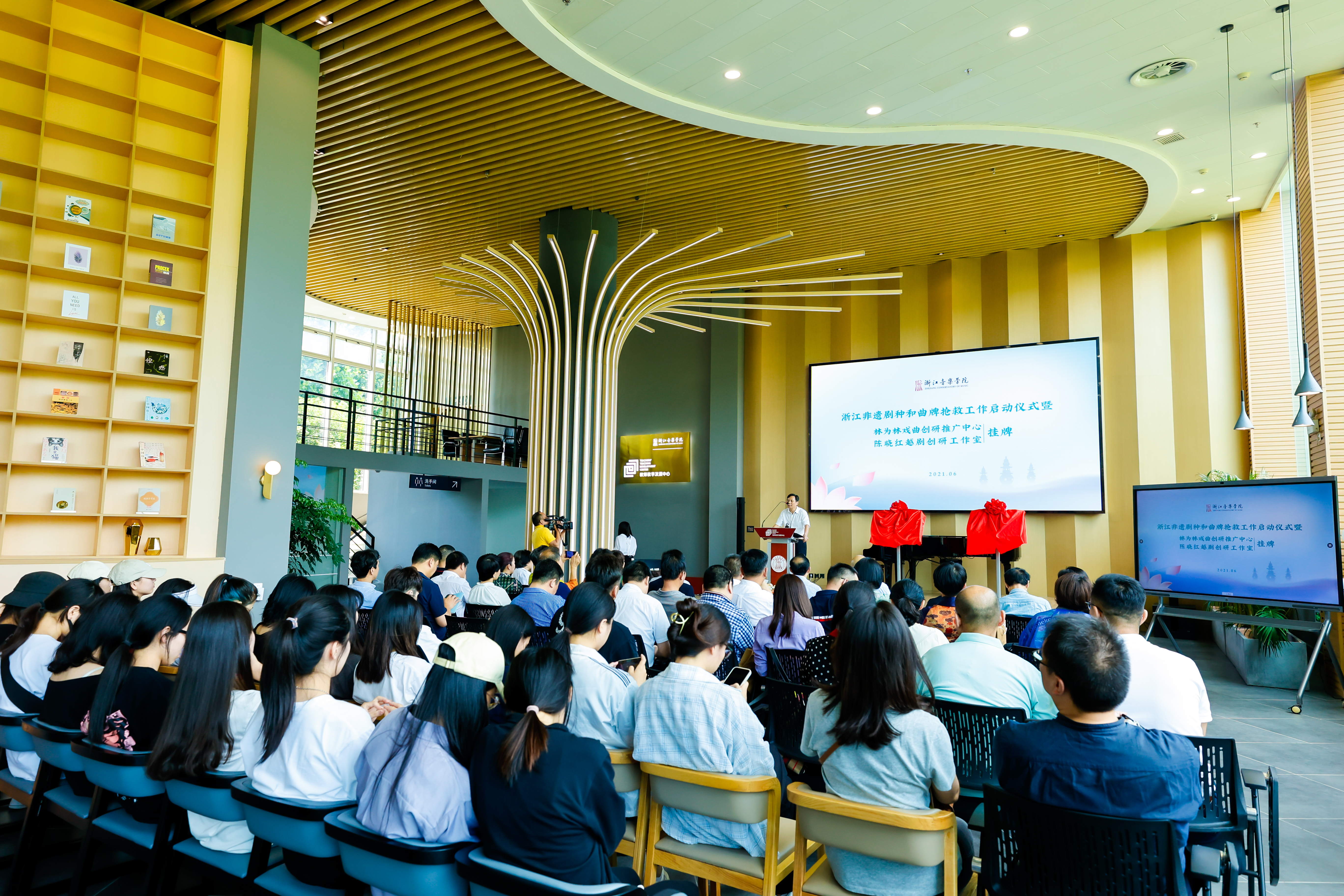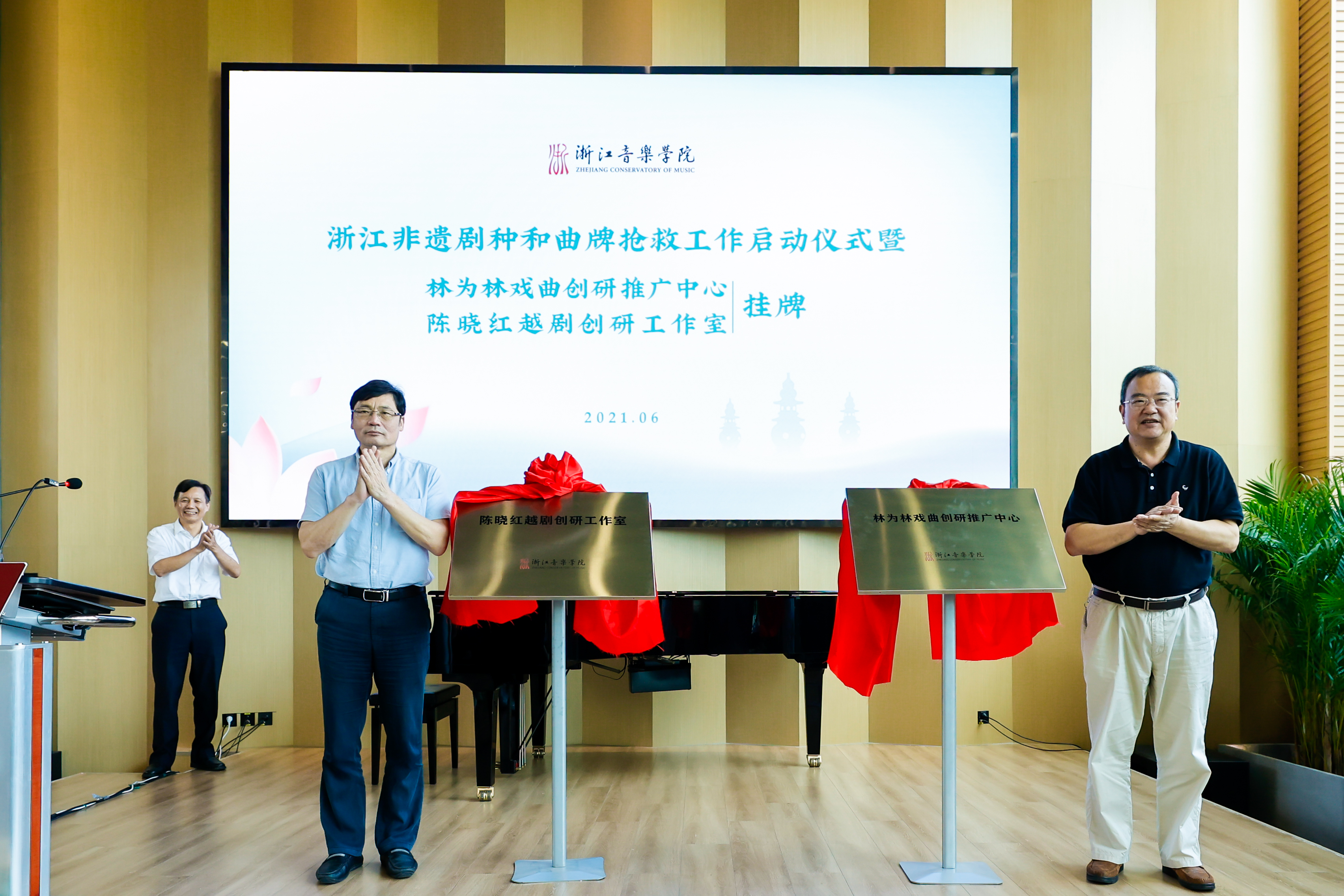 浙江作为戏曲大省,拥有丰富的戏曲非遗剧种资源,以其独有的美学品格在浙江文化遗产中占据重要地位。然而,浙江部分非遗剧种尤其是曲牌,随着老艺人的离世、传承人群断档等原因,面临着流失风险,迫切需要进行抢救性保护。为此,省文化和旅游厅主动发起了抢救曲牌、传承非遗戏曲的时代重任,通过数字化等手段,建设全省传统剧种曲牌库。6月23日,浙江非遗剧种和曲牌抢救工作启动仪式暨林为林戏曲创研推广中心、陈晓红越剧创研工作室挂牌仪式在学院举行。省文化和旅游厅厅长褚子育,学院党委书记胡建新、院长王瑞、党委副书记贾秀英,以及国家一级演员、浙江艺术职业学院特聘教授杨小青等20余位有关领导和戏曲名家出席活动。