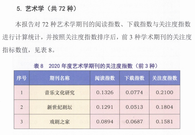 国家哲学社会科学文献中心学术期刊数据库由中国社会科学院创建,用户分布于183个国家和地区,是世界上体量最大的中文哲学社会科学学术期刊开放获取数据库。此次报告主要基于国家哲学社会科学文献中心学术期刊数据库2020年的用户关注和使用数据,以在线阅读量与下载量作为基本统计指标。报告共统计艺术学期刊72种,涵盖了音乐、舞蹈、美术设计、电影电视、戏剧戏曲及综合艺术等学科领域,音乐类主要学术期刊及各音乐学院学报均包含在内。