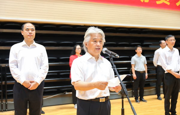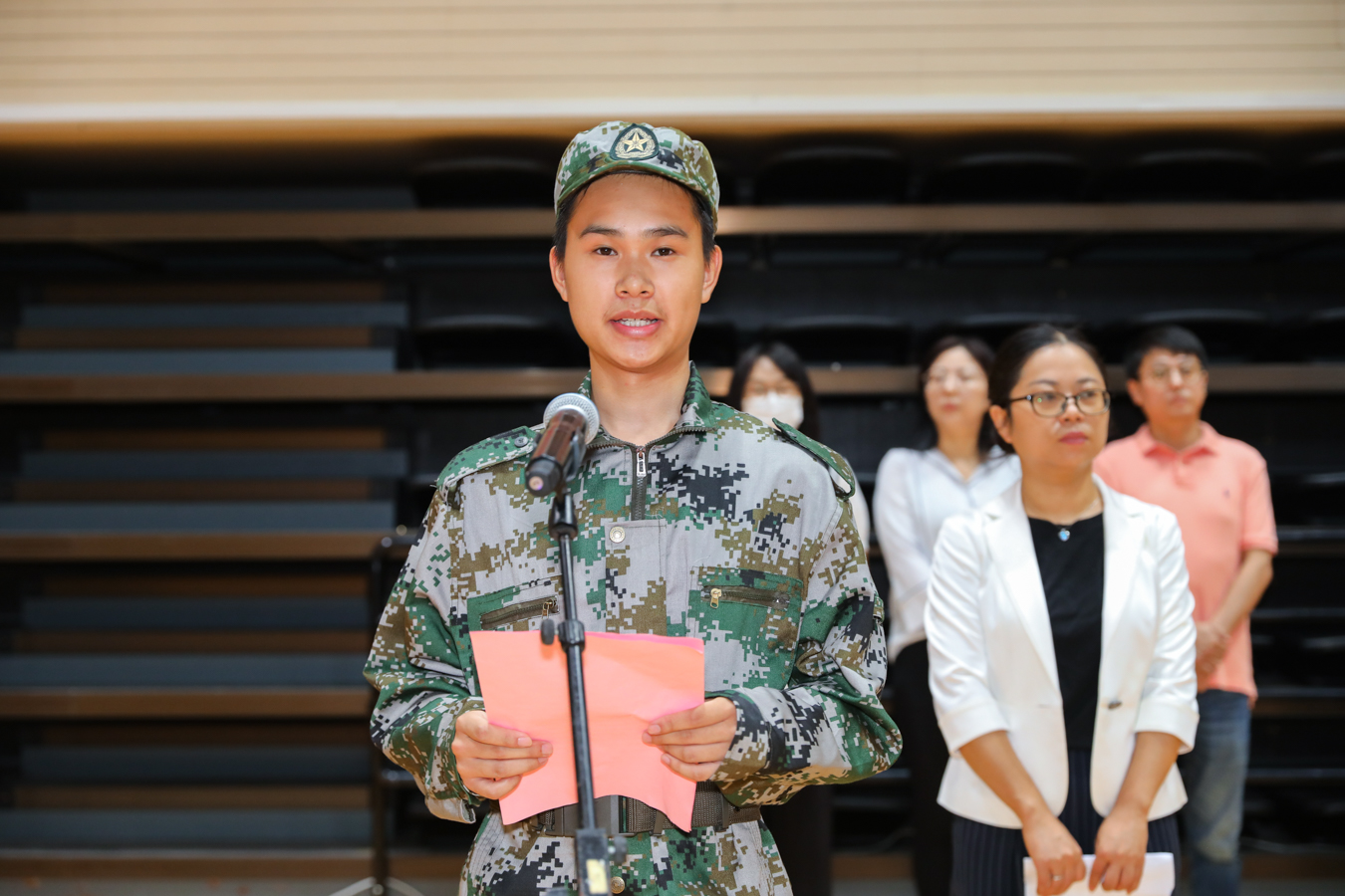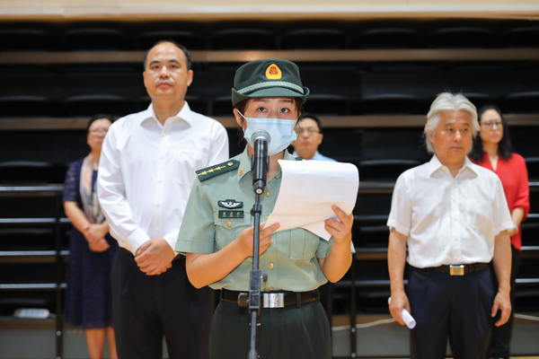 学生代表、音乐教育学院211班黄一家向全体新生发出倡议:一要服从命令,听从指挥;二要刻苦学习,磨炼意志;三要传承发扬,巩固成果。坚定战胜困难的信心,挥洒汗水,收获欢笑和友谊,共同书写大学军训的美好记忆。时刻准备着:不忘初心,志在千秋,激扬青春,强国有我。