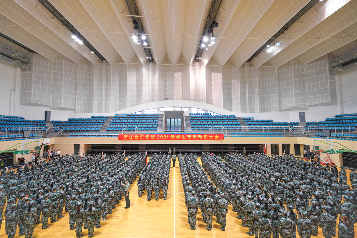 9月13日上午,2021级本科新生军训动员大会在体育馆举行。学院党委副书记王均寅、副院长杨九华,中国人民解放军驻杭某部队上尉、军训营营长樊彦利,相关部门负责人、各系(院)二级党组织负责人、全体辅导员、新生班主任、承训部队教官,以及725名本科新生出席动员大会。大会由学生工作部、人武部负责人主持。