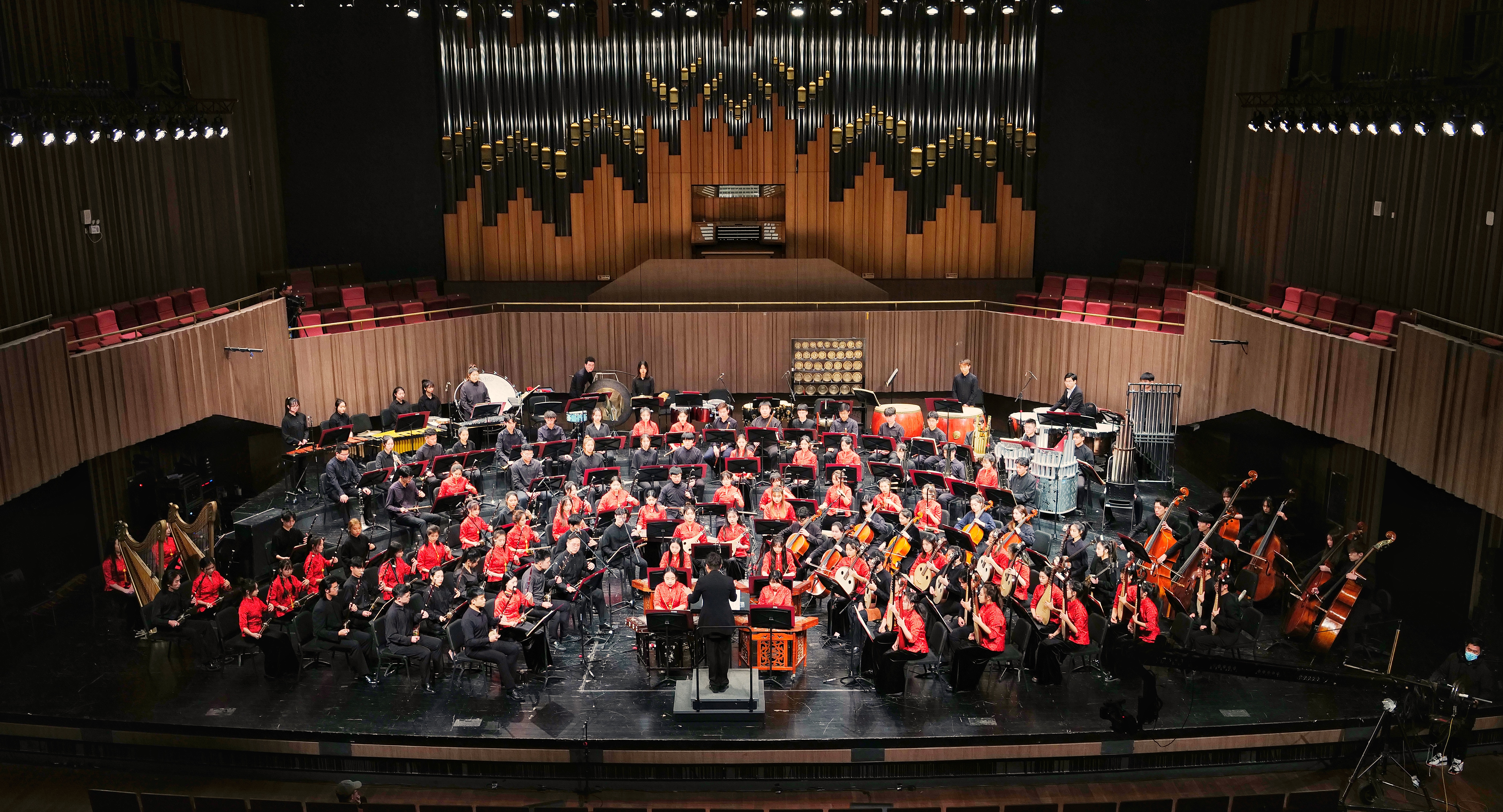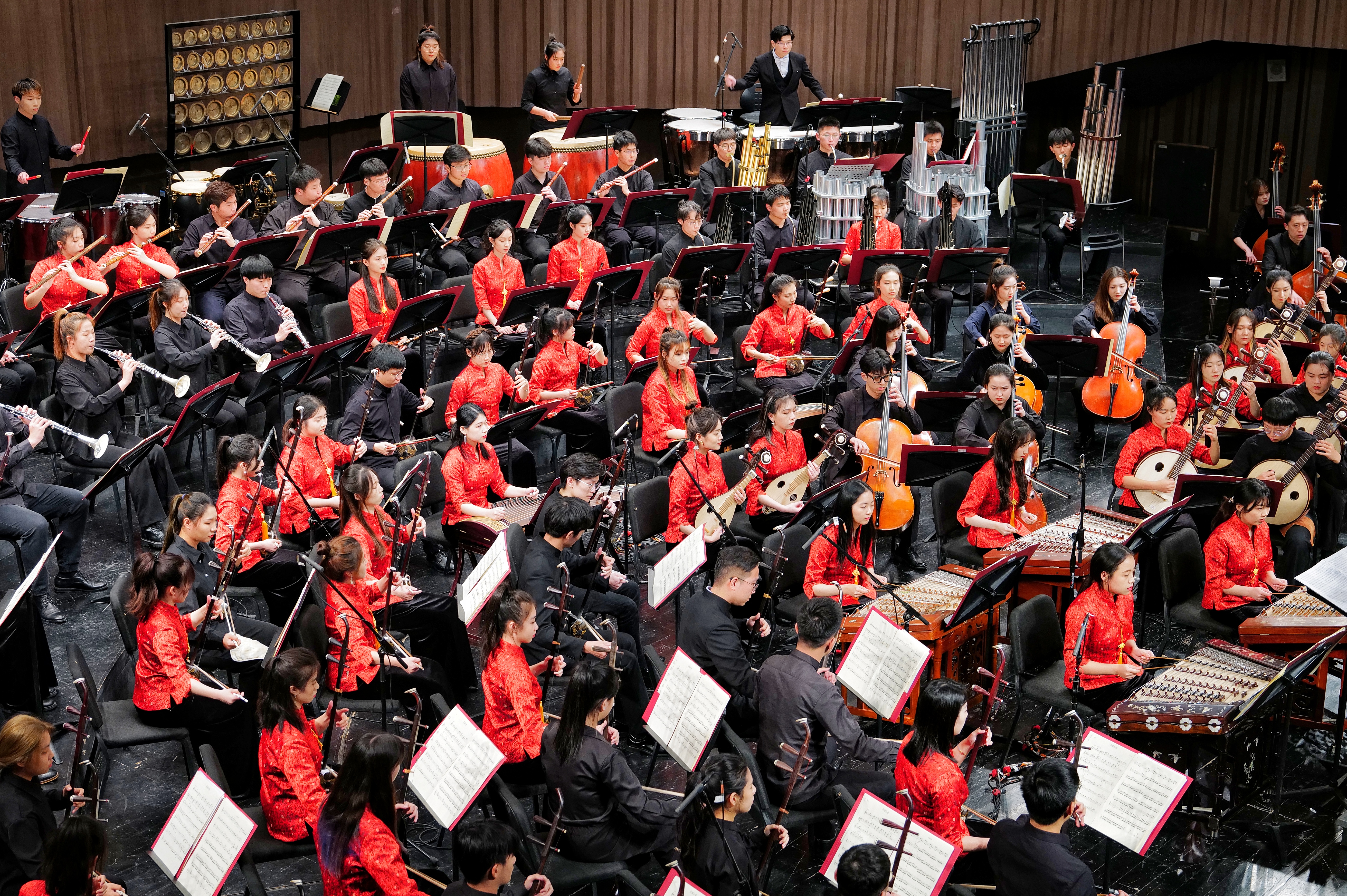 开幕式音乐会带来5首作品,既有民族管弦乐,又有器乐协奏曲,且均为经典之作。第一首作品是郭文景创作的民族管弦乐《阿佤山》,选取了佤族及其他云南少数民族音乐素材,粗犷而不失细腻,带观众走入边陲美景,表现了人与大自然融为一体的永恒力量;第二首是由学院青年作曲家王云飞创作的《英雄壮歌》,磅礴大气、激昂恢弘的旋律让观众感受到中国民族音乐的大气之美;第三首是由国乐系系主任、民族乐队学院艺术总监王甫建教授创作的打击乐与乐队《大河奔流》,用民族管弦乐的声音展示了黄河的奔流,如同中华民族般奋勇前行,生生不息;第四首琵琶协奏曲《草原英雄小姐妹》与第五首二胡协奏曲《长城随想》由国乐系青年教师李跞、孔艳艳分别担任主奏,与青年国乐团共同完成,两首乐曲风格各异,收获了现场观众热烈的掌声。