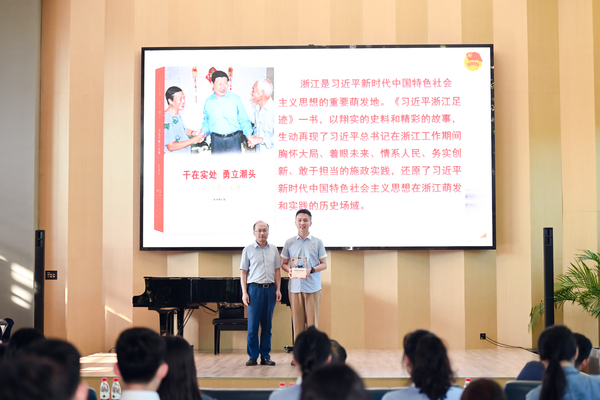 李俊向实践团赠送《干在实处,勇立潮头——习近平浙江足迹》一书。社会实践接收地代表德清县常委、宣传部部长周志方、柯城区常委、宣传部部长施莹、鹿城区宣传部副部长柯胡斌通过书面或视频的方式,向参与暑期社会实践的师生表示热烈的欢迎。
