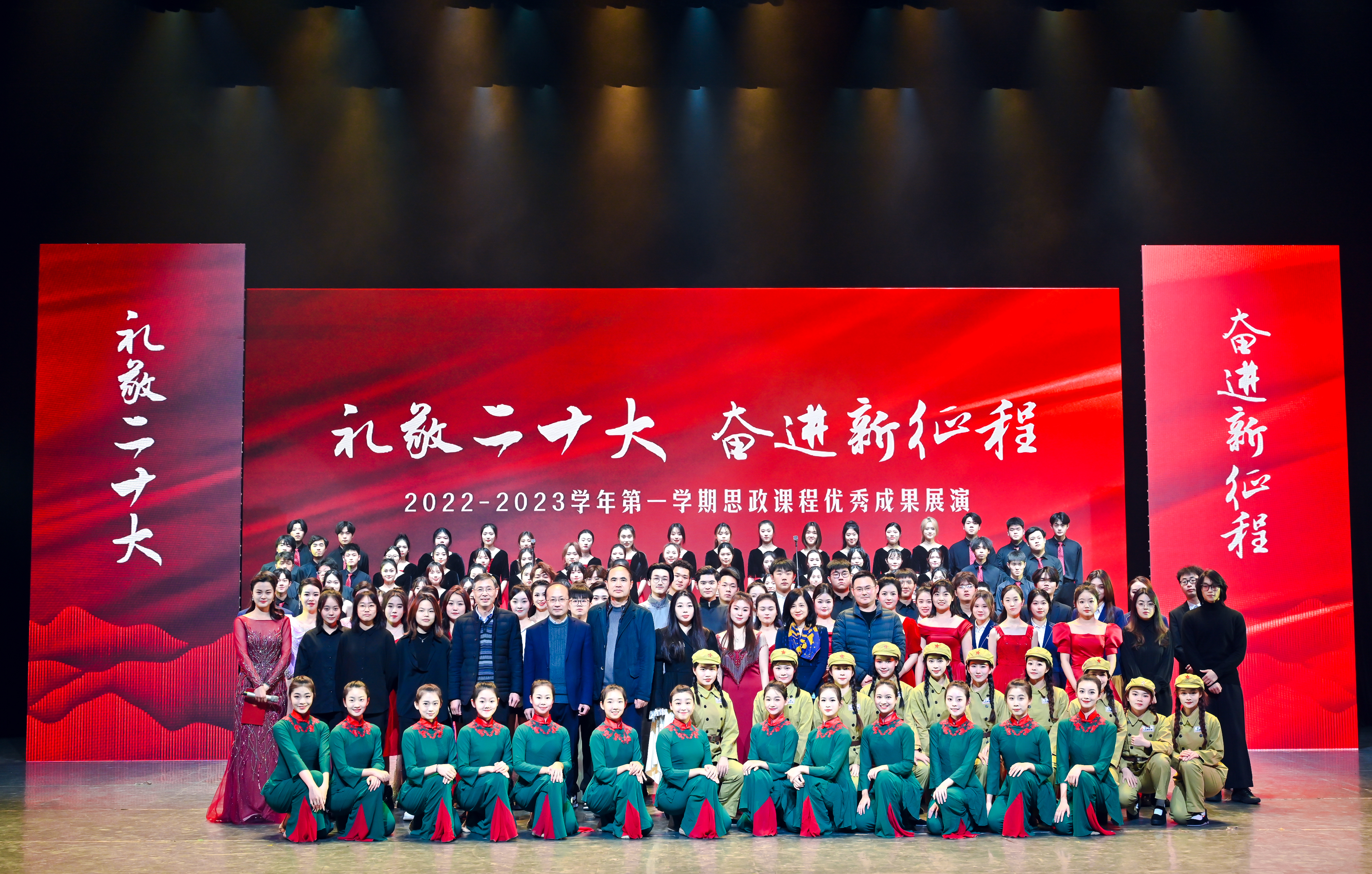 此次展演是学院举办的第九场思政课程优秀成果展演。近年来,学院全面贯彻落实习近平总书记在学校思想政治理论课教师座谈会上的讲话精神,深入贯彻落实《关于加强马克思主义学院建设的实施方案》,注重思政课教学创新改革,探索出一条“思政+音乐”的特色教学之路。马克思主义学院在思政课上列出“菜单式”清单,引导学生立足课堂教学、依托课程教材、依靠专业特点,用艺术形式演绎和再现思政课程教学内容;各院系的专任教师担纲艺术指导,从专业角度确保节目的高品质和表现力;参演学生珍惜上台演出的难得机会,在课业之余认真编排节目并反复排练,深入把握节目思想内涵和角色演绎。三者的倾情投入,使思政课程优秀成果展演的思想性、教育性和艺术性得到充分彰显,让所有的参与者和观众沉浸式地接受心灵的洗礼,进一步强化了对党的热爱并焕发出奋进新时代新征程的动力和激情。作为实践教学的延伸和深化,思政课程优秀成果展演正在成为检验检阅学院大思政工作的有效方式和落实三全育人的靓丽风景。