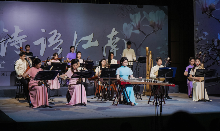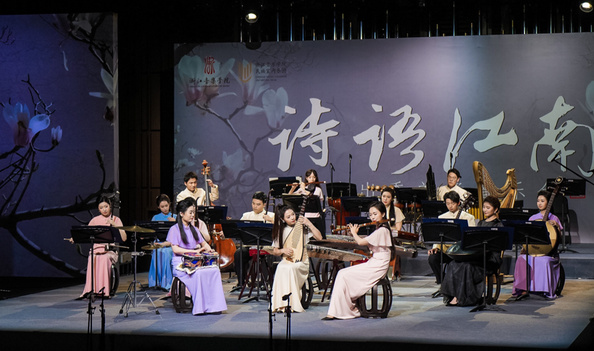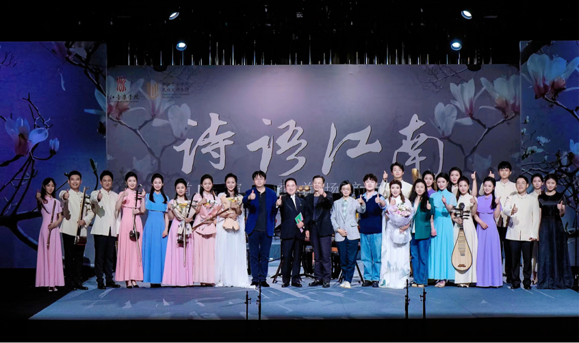 音乐会下半场的第一首作品是赵松庭作曲的竹笛和歌《幽兰逢春》。作品由张晶洁主奏,以悠扬婉转的旋律,表达出哀而不伤的人生之春。刘天华的《良宵》是一首耳熟能详的二胡经典名作。作品用优美的旋律表现了与友人共度良宵的欢愉心情。当晚上演的是由王甫建改编后的版本,由国乐系“弦风”组合演奏,通过多个声部的配合交织,将经典旋律演绎出新的风格,为民乐注入了新的激情和魅力。知否知否,应是绿肥红瘦。唢呐与小乐队带来的《如醉如梦》以独特的音色唤起了现场观众的别样视听体验。作品灵感来自宋代著名词人李清照的《如梦令》,由李博作曲,由浙音硕士研究生陈铭楠演奏。本场音乐会最后一首曲目是王甫建创作的民族室内乐《江上明月》。该作品描写了月下钱塘江水波光粼粼的唯美画面。曲调时而轻柔婉转,时而激越昂扬,将月光如水、水如天的浪漫意境,完美呈现在观众面前,展现了江南水乡的古韵之美和风景之美。最后,音乐会在观众们的掌声中圆满落下帷幕。