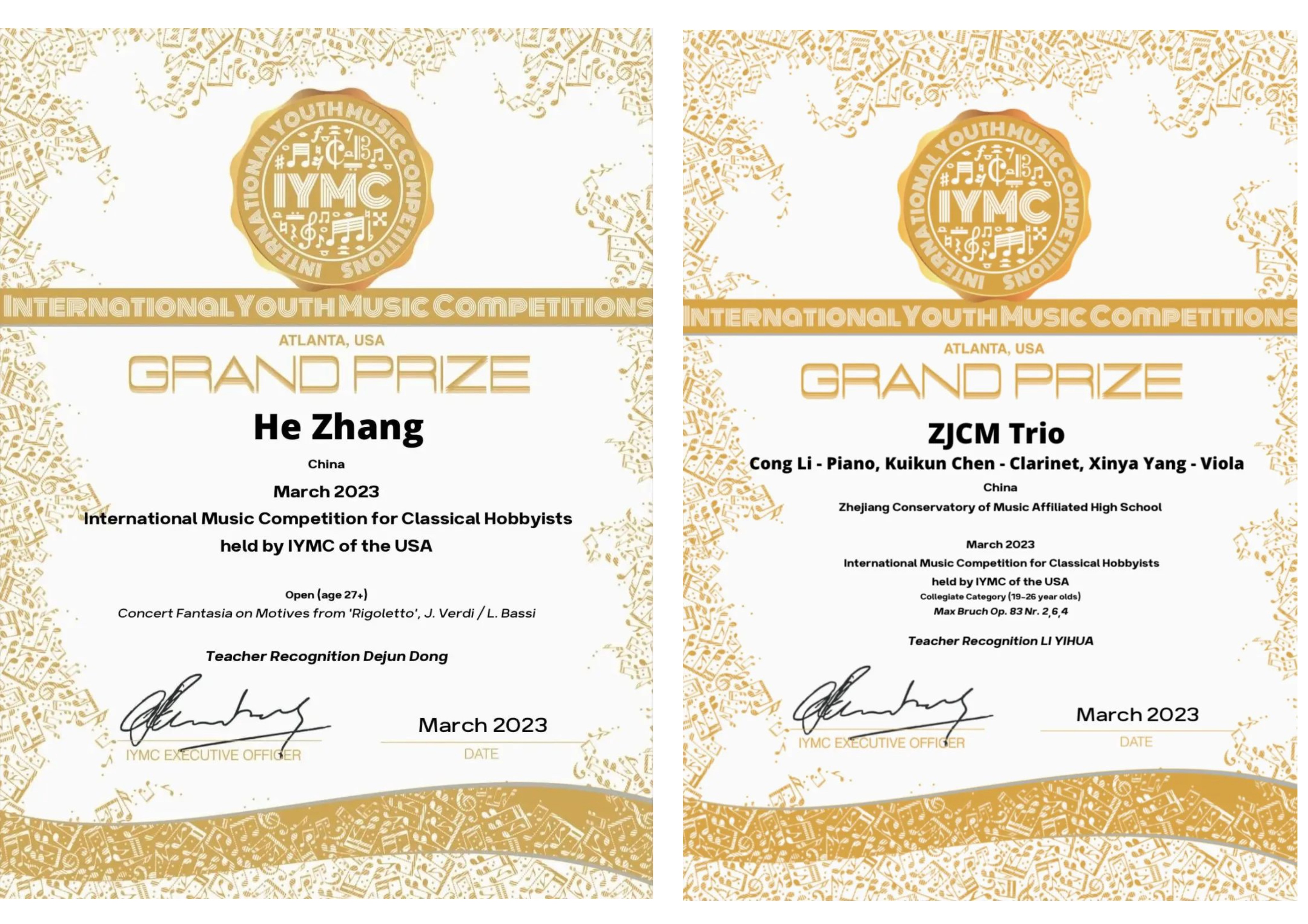 近日,美国IYMC国际青年音乐大赛落下帷幕,管弦系研究生张赫凭借《弄臣》主题幻想曲,以总分100的成绩荣获国际音乐比赛大奖(27岁以上组别),指导老师董德君教授荣获最佳教师奖。管弦系学生李聪、陈奎坤、杨欣雅组成的三重奏组合荣获国际音乐比赛大奖(学院组19-26岁),指导老师李艺花副教授。