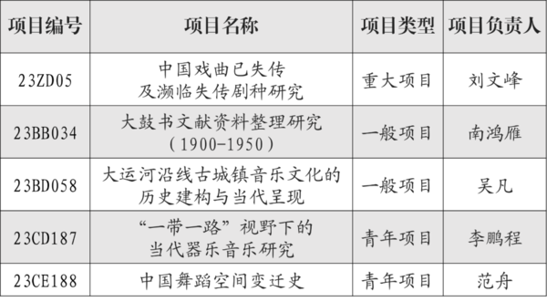 近日,全国艺术科学规划领导小组办公室公布了2023年度国家社科基金艺术学项目立项名单,我校4个项目获批2023年度国家社科基金艺术学项目。其中,《中国戏曲已失传及濒临失传剧种研究 》(项目负责人:刘文峰 ) 获批重大项目,《大鼓书文献资料整理研究(1900-1950) 》(项目负责人:南鸿雁) 、《大运河沿线古城镇音乐文化的历史建构与当代呈现》(项目负责人:吴凡)获批一般项目 、《“一带一路”视野下的当代器乐音乐研究》(项目负责人:李鹏程) 、《中国舞蹈空间变迁史 》(项目负责人:范舟) 获批青年项目。