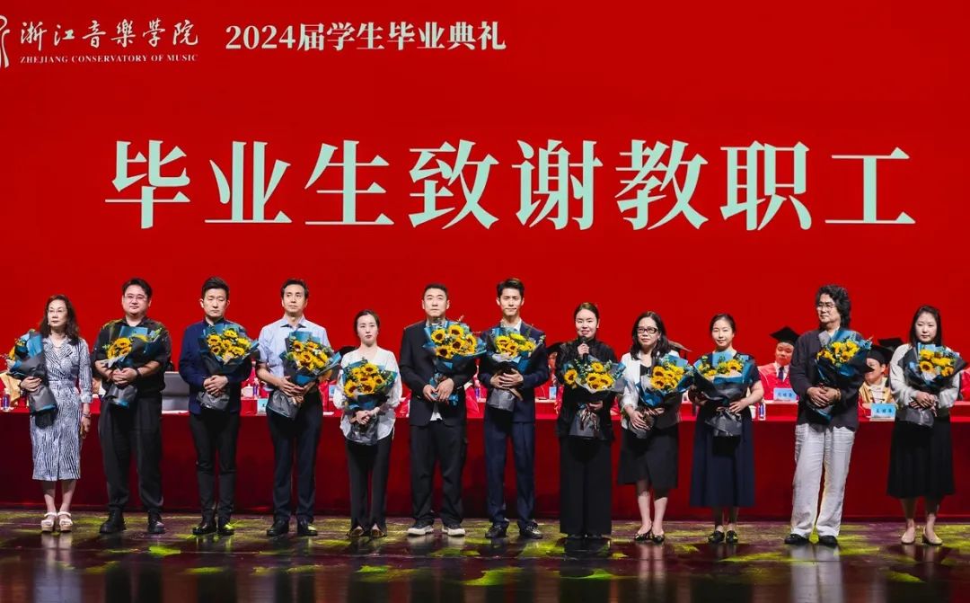 各院系教师代表,以及后勤、乐典等部门职工代表接受毕业生代表献花,并为毕业生送上祝福。