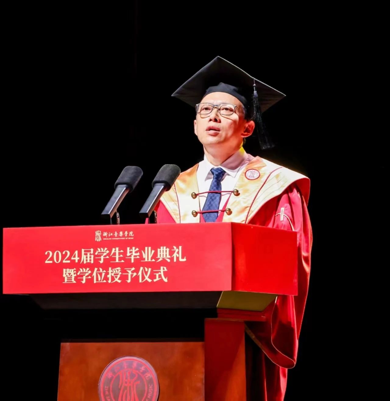 他表示,数智时代和新质生产力是一种因与果的关系。在座毕业生,正是最活跃、最基础的新质生产力要素,是具有创新能力、创造精神、适应新时代特点和发展要求的新一代的劳动者。大学生涯是短暂的,但浙音的创新文化和浙音精神对于养成浙音人特有的精神气质和人文情怀弥足珍贵,这也是学校给予同学们最好的教育和最宝贵的精神财富。最后,他寄语全体毕业生,要始终秉持浙音的创新文化和精神价值观,在意外中找寻希望,在挑战中找寻勇气,穿越喧嚣在寂静中找到真我,牢记数智时代艺术家的追求是数智力量、艺术精神与新质生产力,并且始终坚信,无论是农耕时代还是数智时代,那些彰显人性光辉、人格力量、饱含情感张力和人性温度的艺术精神与艺术作品将永远无可替代,并始终成为指引人类前行的灯火。