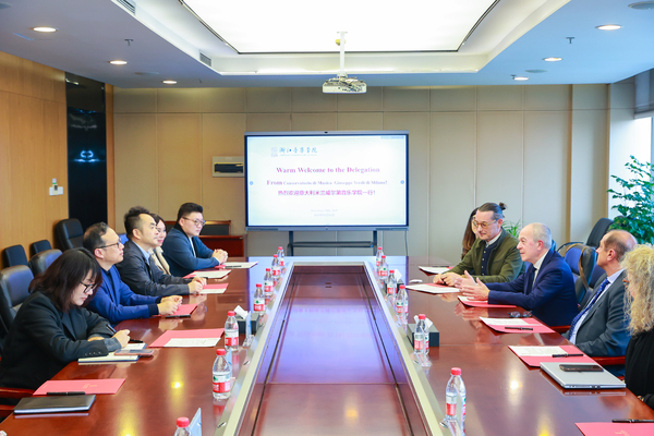11月14日,意大利米兰威尔第音乐学院院长马西米利亚诺·巴乔一行到访浙音,院长王瑞会见并与之座谈,副院长董德君参加,国际交流合作处、艺术处、声乐歌剧系相关负责人陪同。
